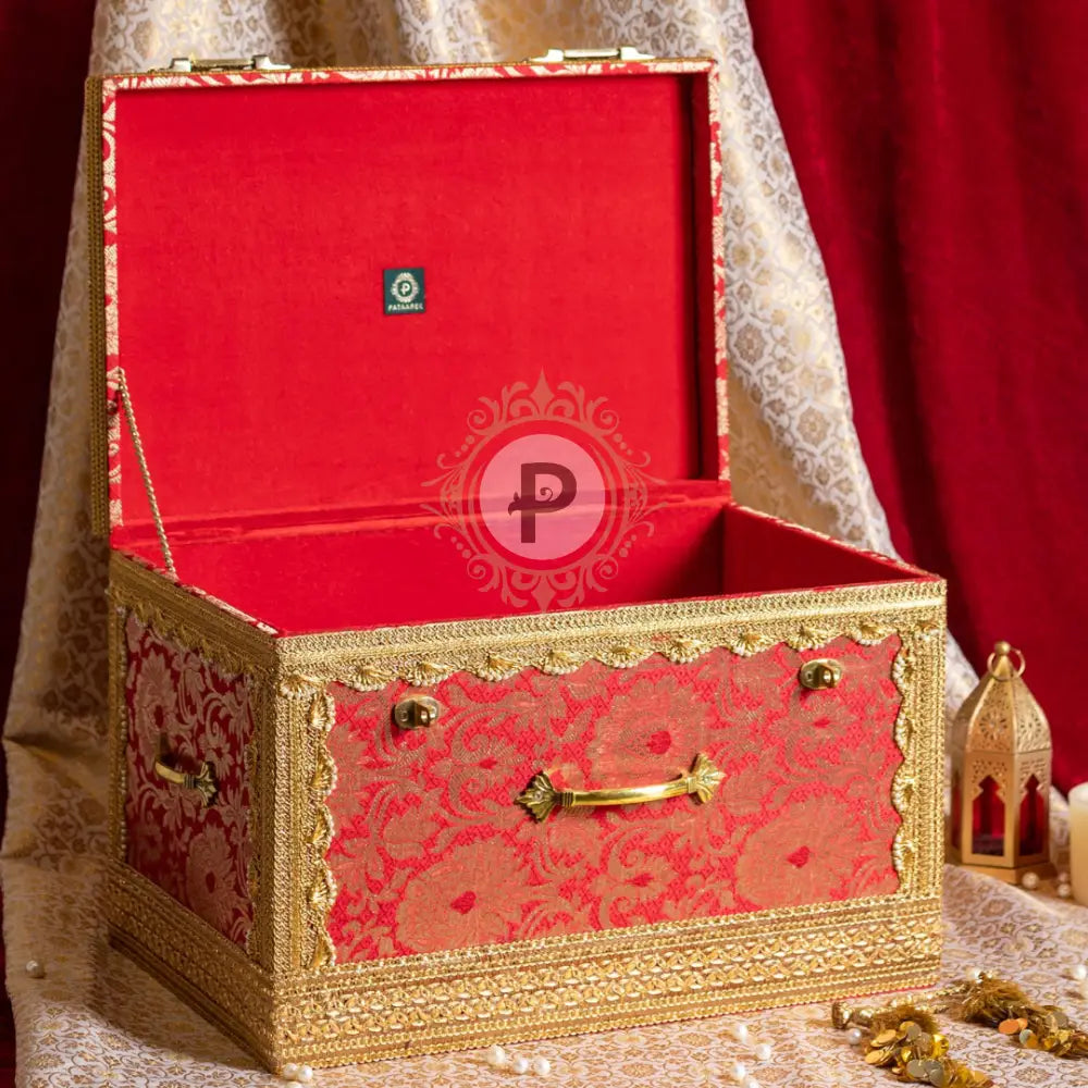 When it comes to trousseau trunks, we can confidently say that our red brocade trunk is a bride’s dream, so beautifully and lovingly handcrafted in tones of the true wedding colours - a ravishing red and a glowing gold. With gold trims lending a fine frame and finish to the trunk, the Pataaree latches ready to lock in prized possessions, the red brocade trunk is a gilded piece of heirloom. It’s a forever piece. Get yours now, available in size 18”.