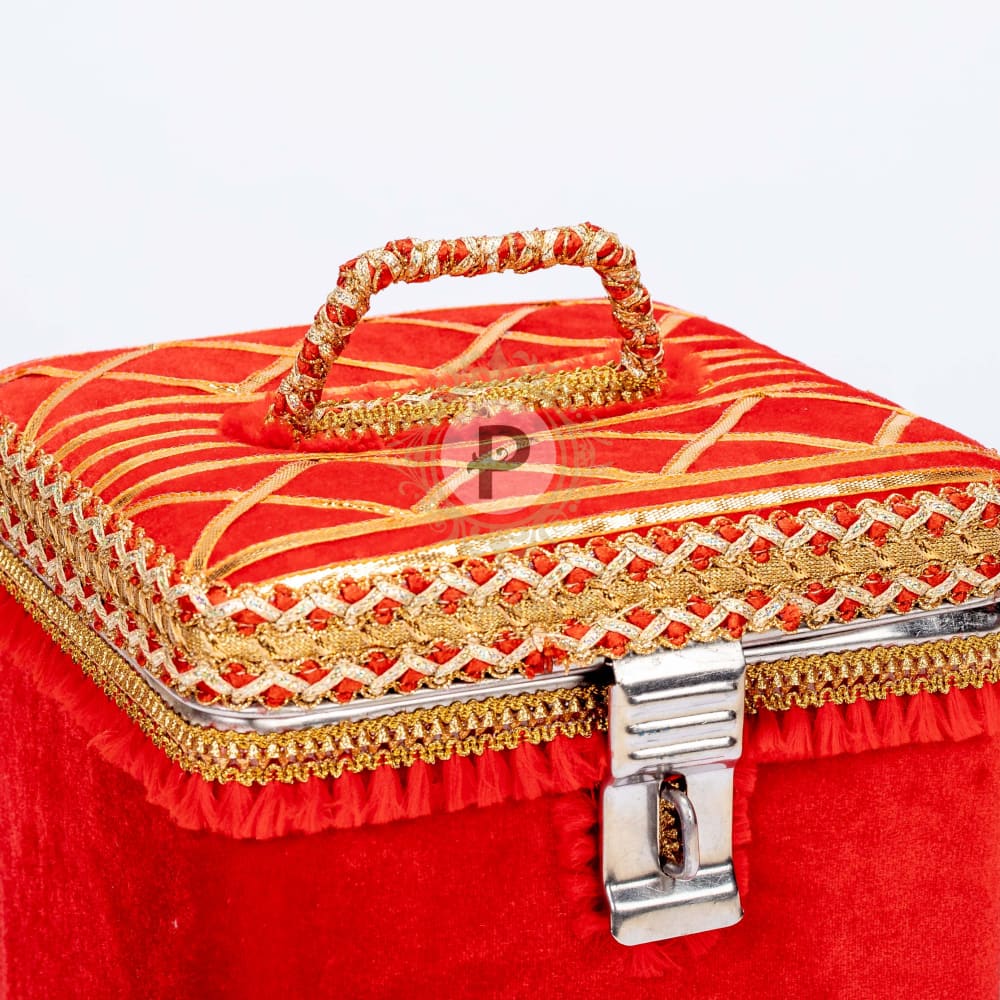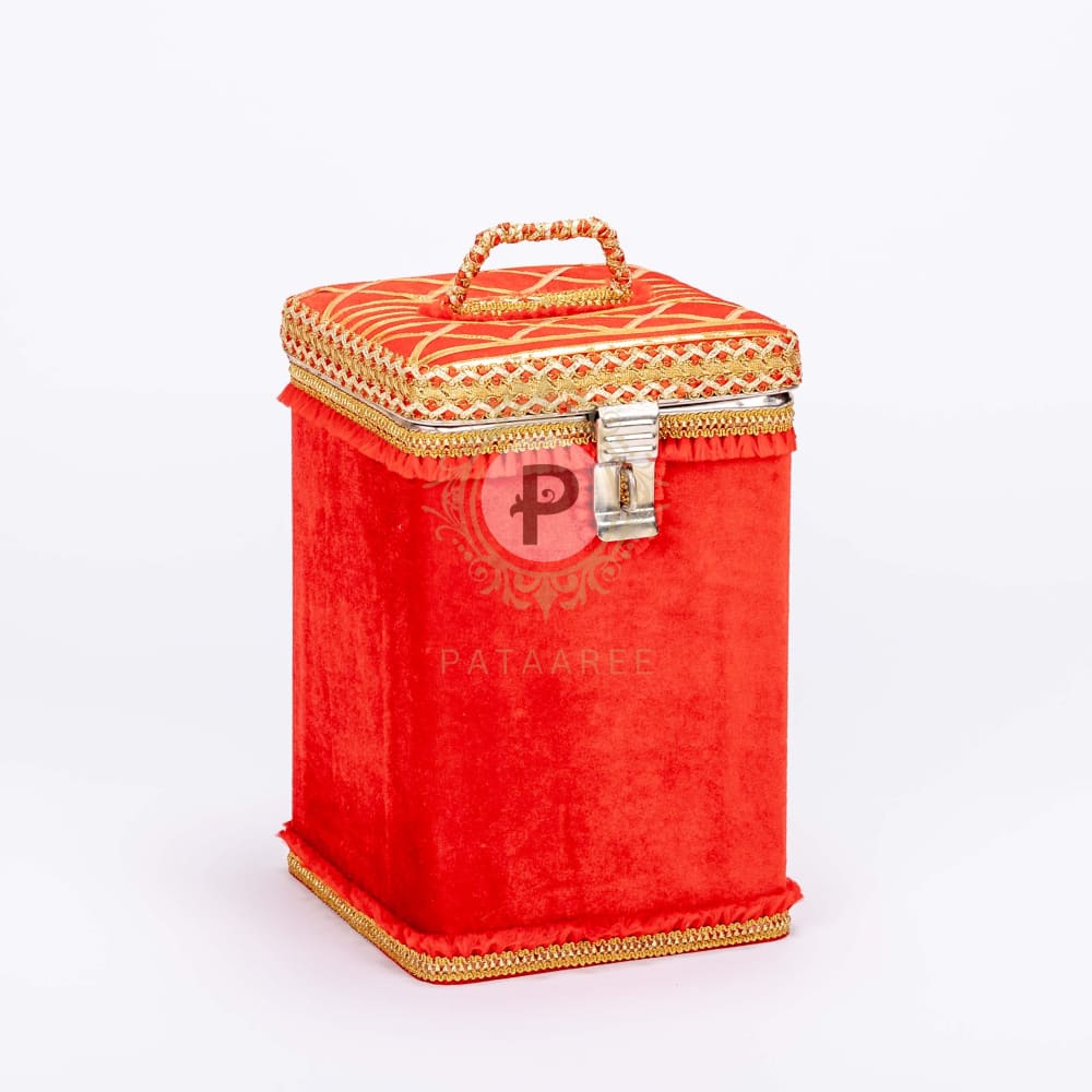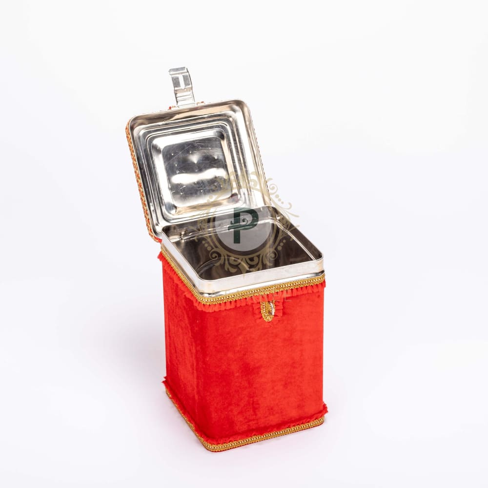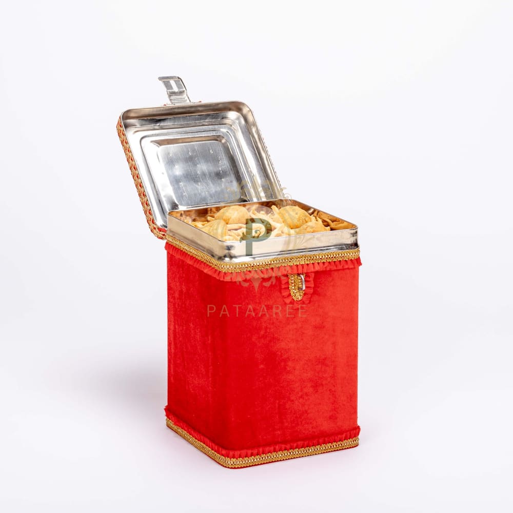 Our red velvet bhaji box is a stylish revamp of the mundane steel tall laddoo/bhaji box, also called ‘Pippa’ in Punjabi. Load it with mithai - 3 to 5 kilos - and present or gift it.