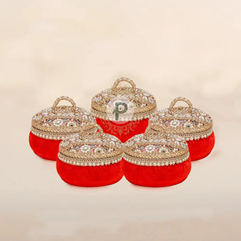 Elegantly wrapped in rich red velvet, these charming laddoo boxes make a delightful statement. Adorned with intricate pearl, mirror, and bead dabka work, they’re perfect for holding traditional sweets like panjiri and dry fruits—ideal for Shagun ceremonies and heartfelt gifting.