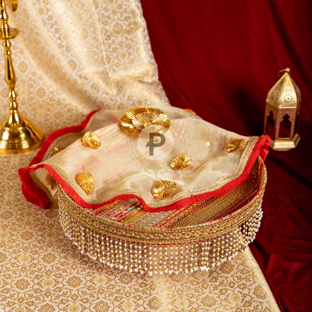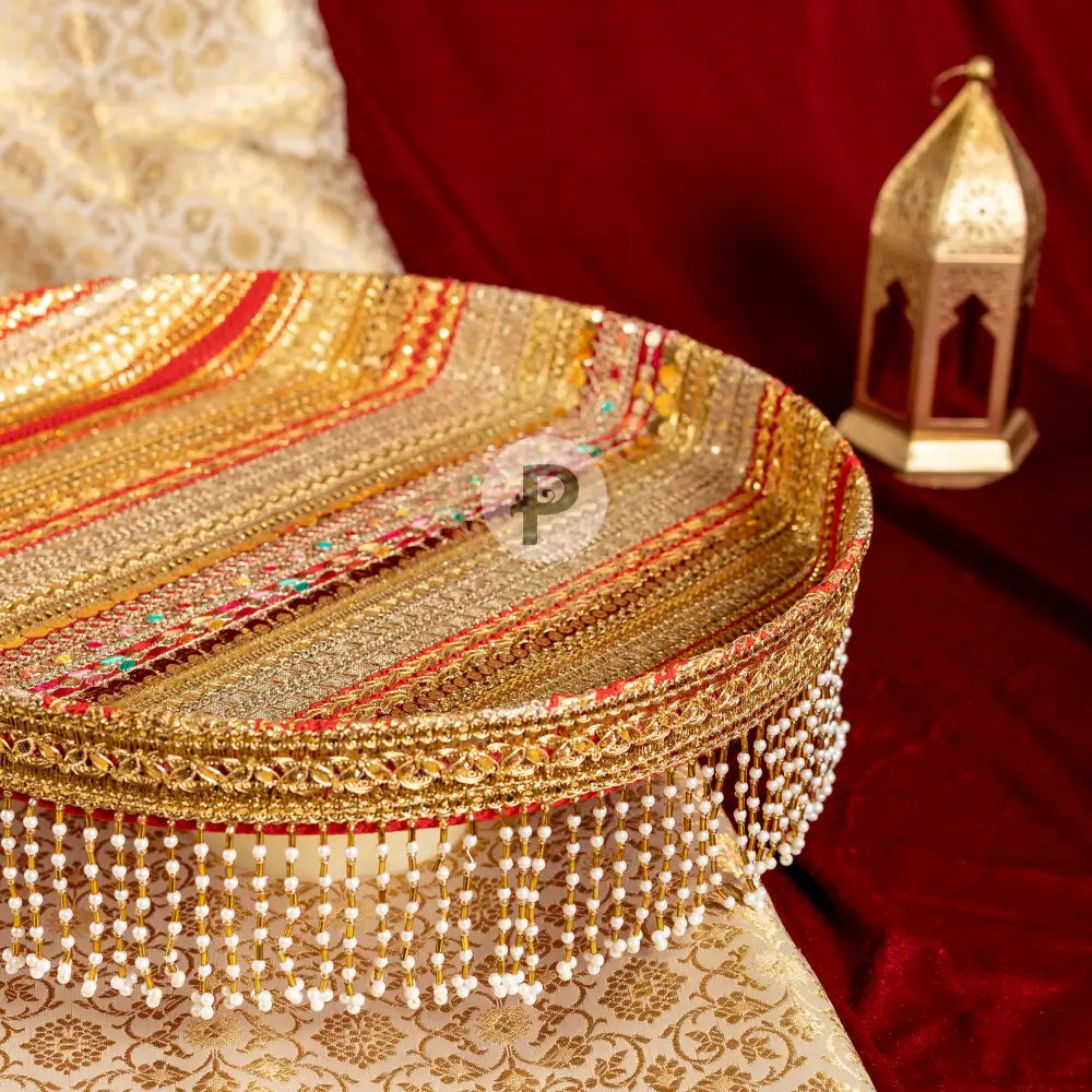 Give your ceremony a fashionable twist with our elegantly designed, the vibrant satrangi thaal with pearl trims and a beautiful thaal cover handcrafted with red trims and golden phull. You can pick it for your shagun, haldi and chura ceremony or for welcome at the gate and tikka ceremony. Check it out here.