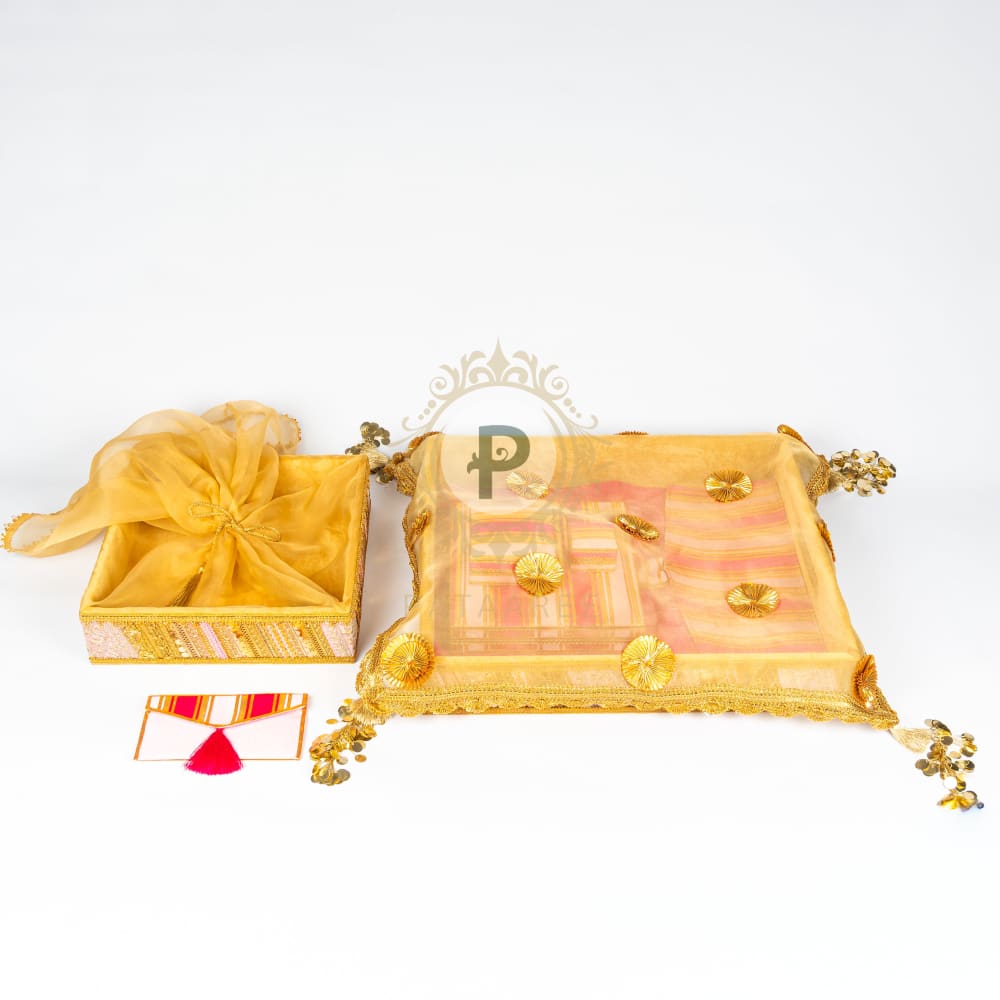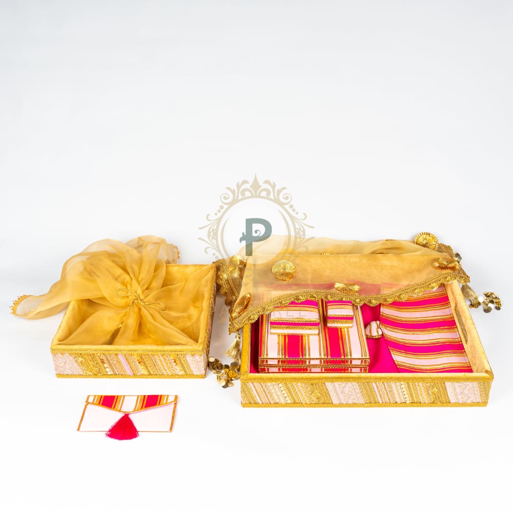 Set Includes: 1 Pink Satrangi Tray with Cover, 1 Pink Satrangi Tissue Basket, 1 Surati Jewellery Box, 1 Surati Single Kada Box, 1 Surati Suit Cover, 1 Shagun Envelope, and 1 Surati Ring Box