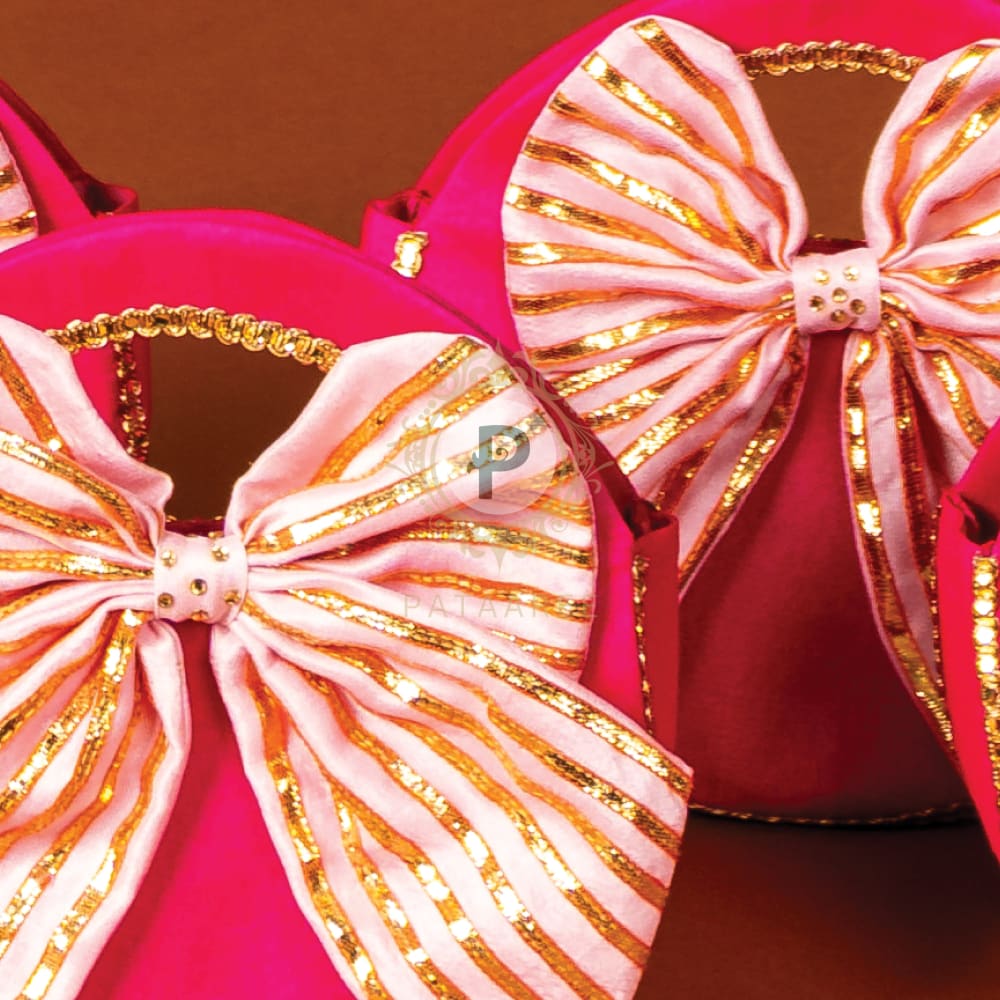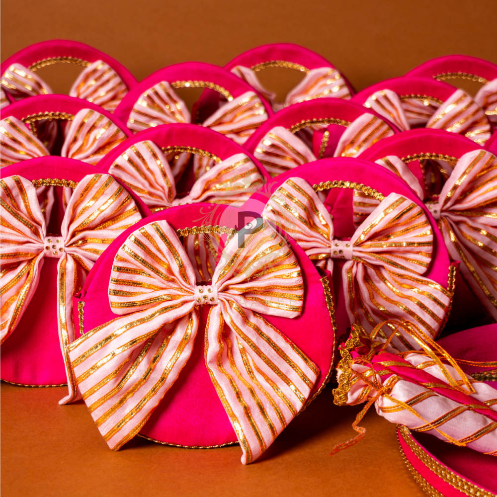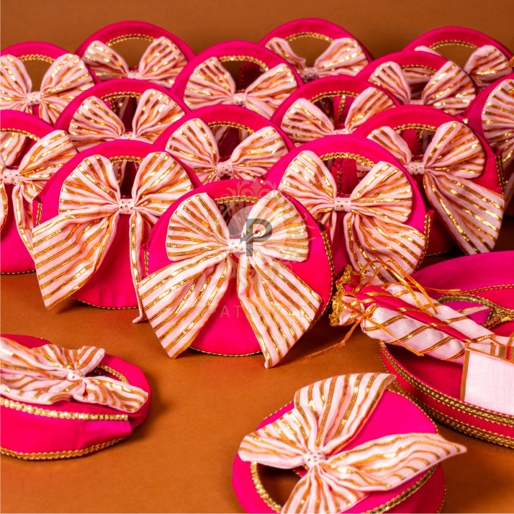 The Surati Bow Favor Bag is designed to elevate your gifting moments with effortless charm. Crafted in luxurious silk fabric and finished with an elegant structured bow, it brings a touch of modern festivity to every wedding, bridesmaid hamper, or event giveaway. Lightweight, timeless, and beautifully detailed - this is the kind of favor that feels just as special as the occasion itself.
