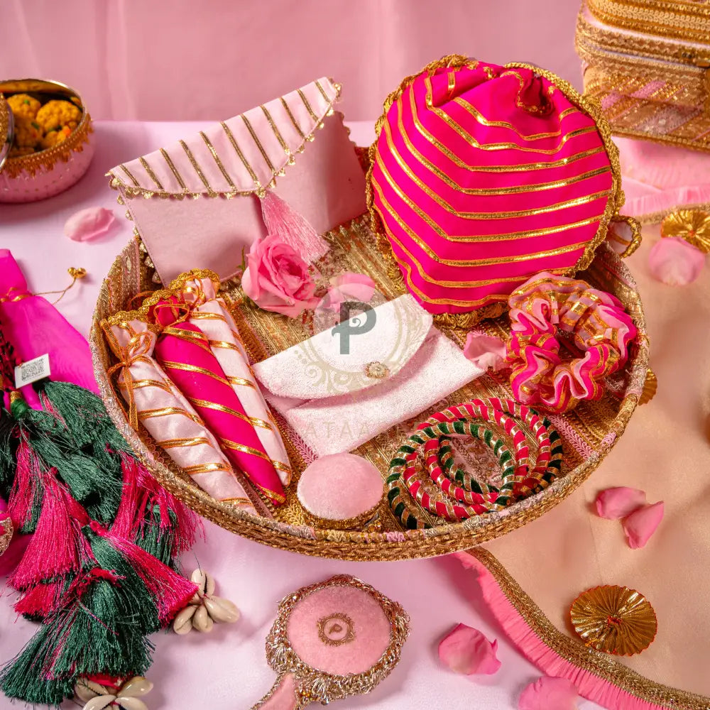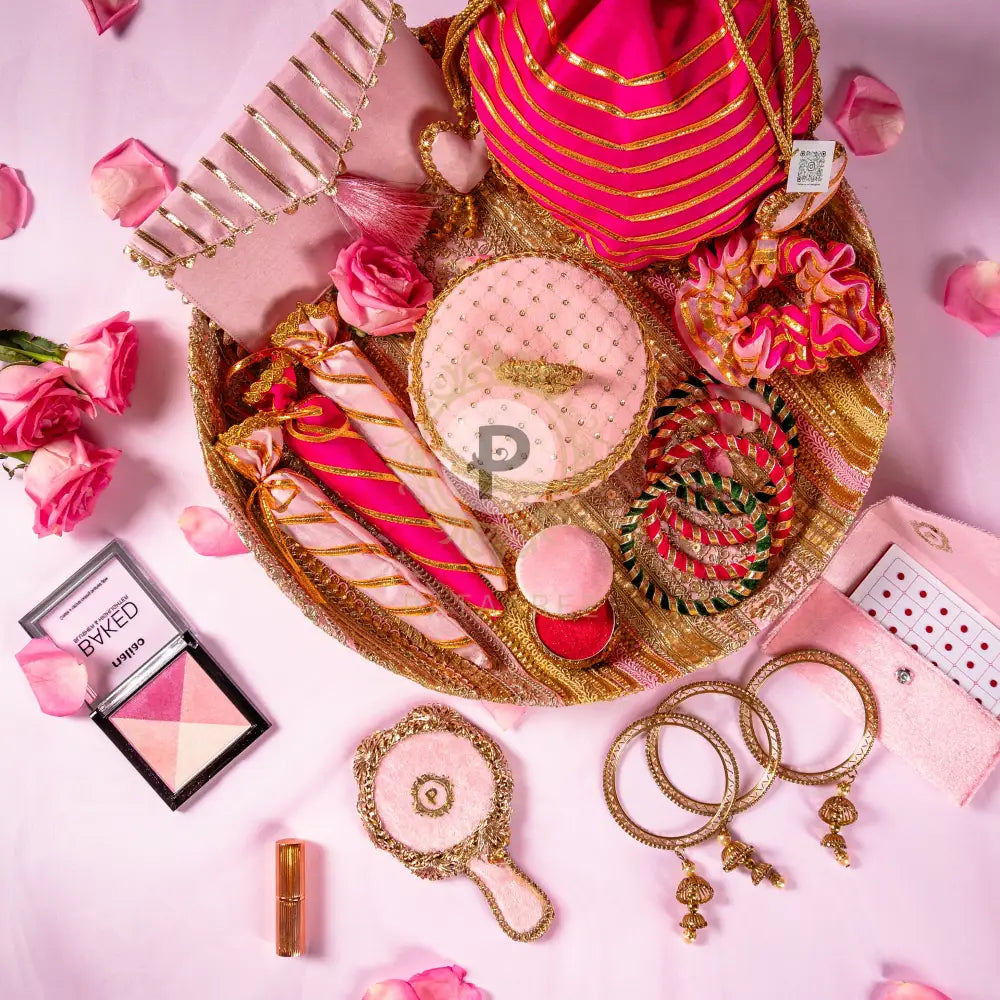 Celebrate the vibrant spirit of Teej with our Teejh Celebration Hamper, a thoughtfully curated ensemble of festive essentials designed to honour tradition with a modern flair. Drenched in rich pinks and elegant pastels, this hamper brings together handcrafted elements that add beauty, sentiment, and cultural charm to your celebrations. Wrapped in love and tradition, this hamper is perfect for gifting or indulging in your own Teej rituals. It's not just a set – it's a celebration of womanhood, heritage, and festive beauty.