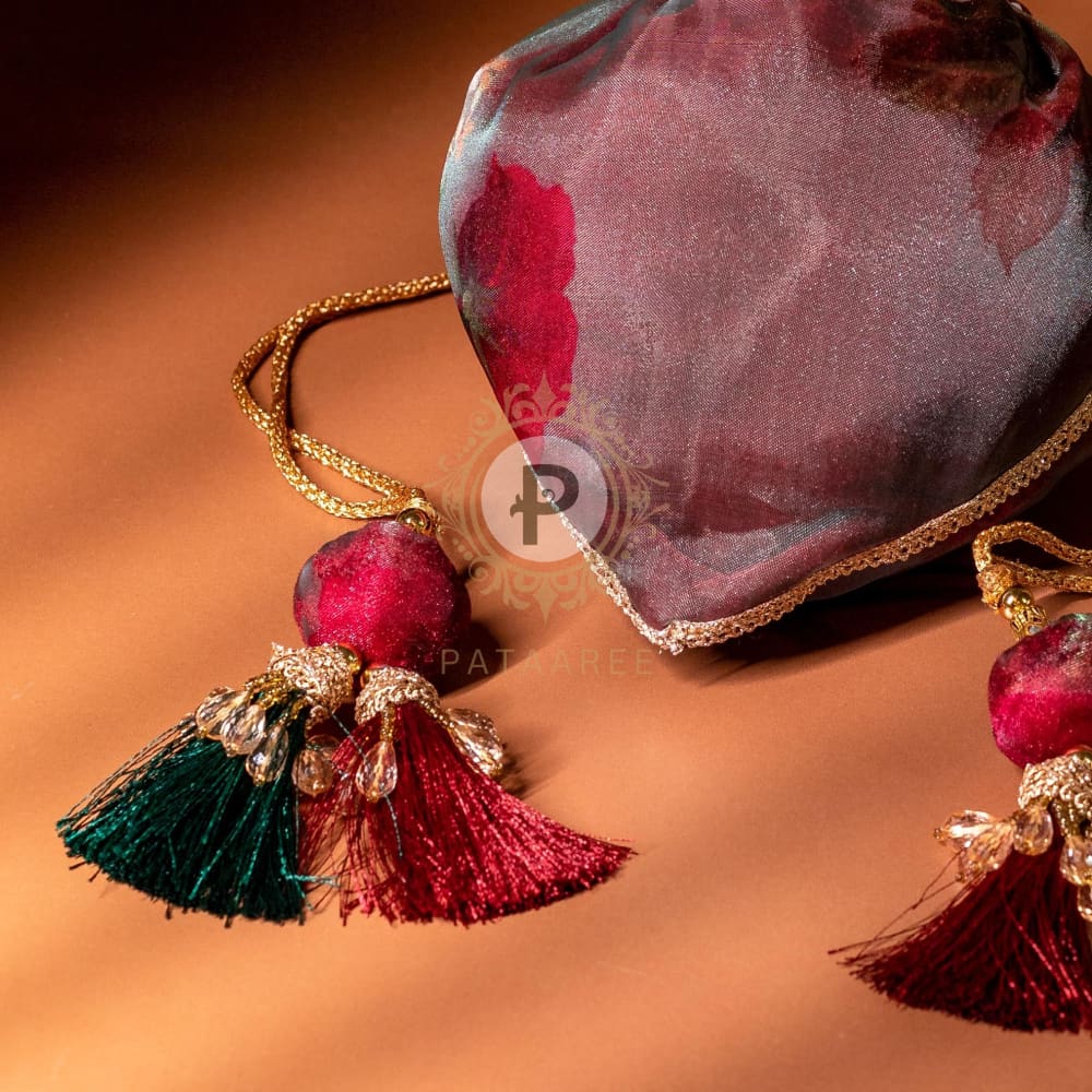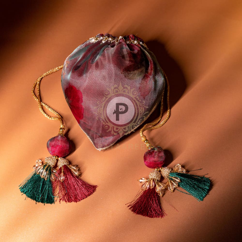 Crafted in the shape of a tulip flower, this potli features floral fabric with maroon tissue, bead, and gota detailing, and is finished with charming latoo tassels. Ideal for Shagun and wedding ceremonies, it can hold dry fruits, mithai, or wedding favors, and makes a perfect bridesmaid gift.