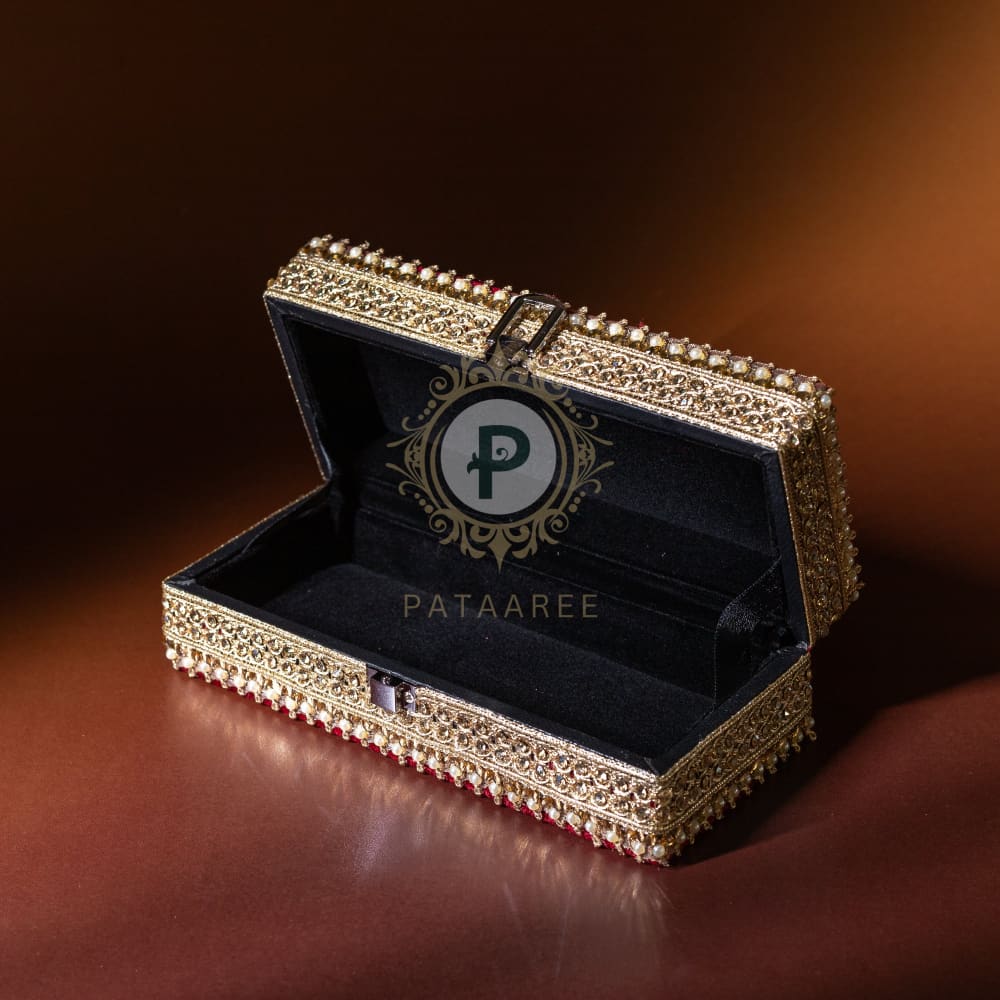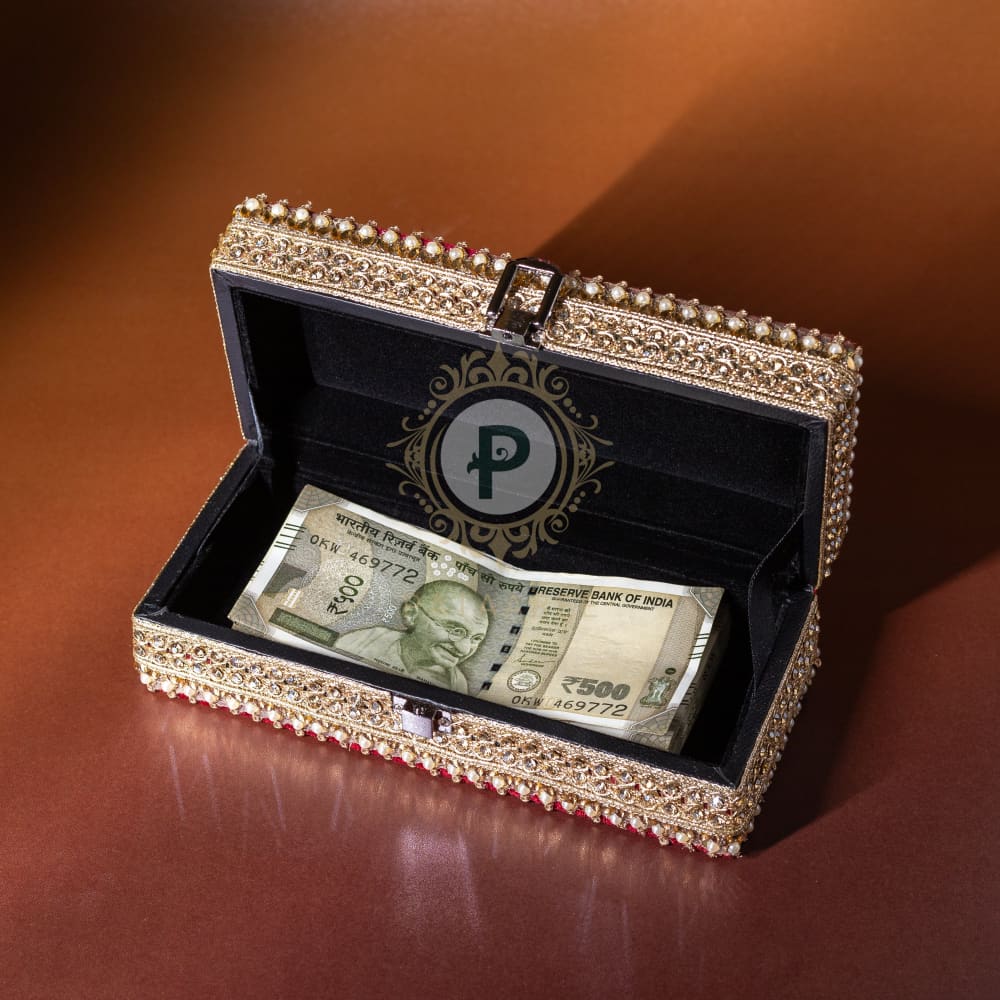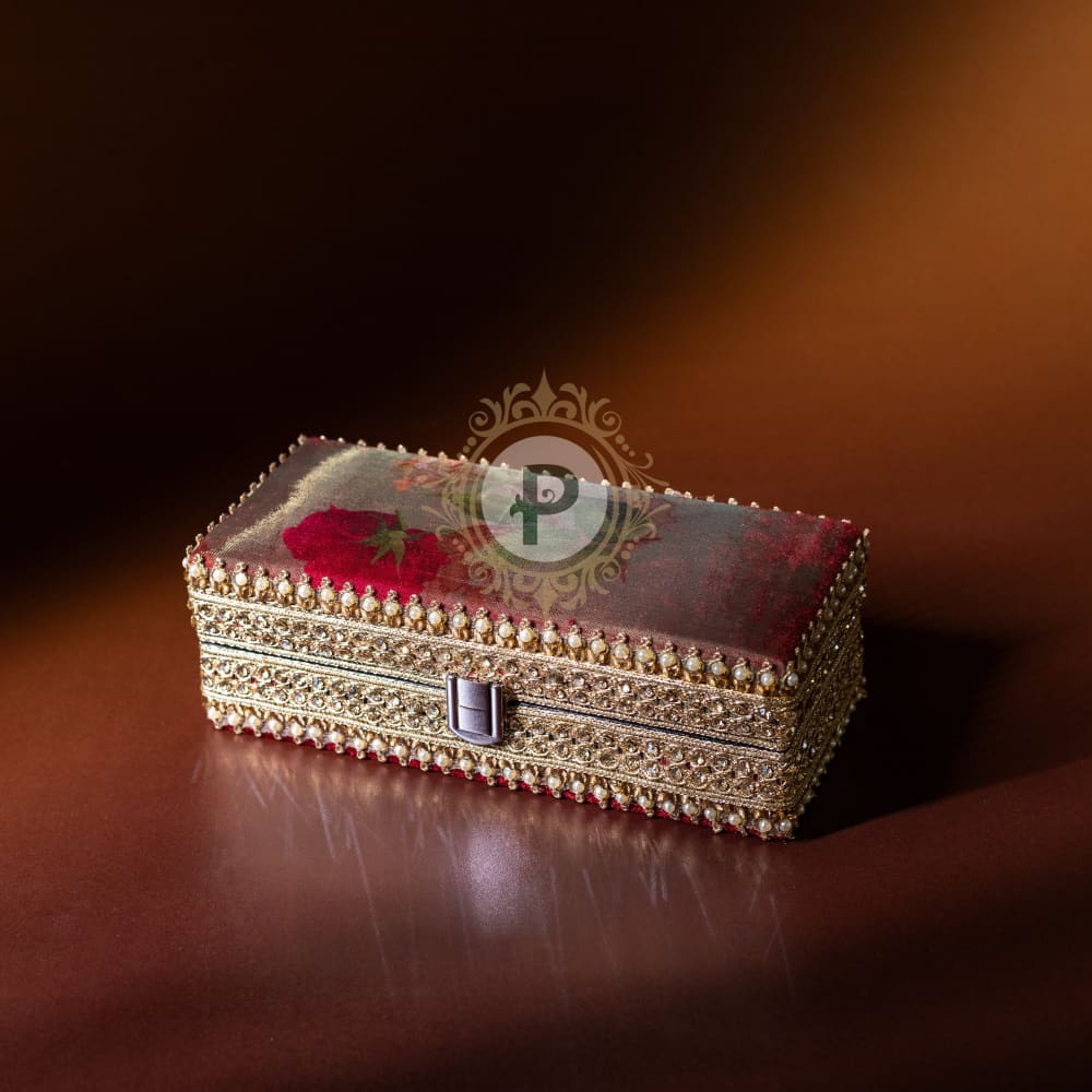 For that generous amount of Shagun, or a fat gift in cash, instead of envelopes go for the Surkh collection cash box, a gorgeous little rectangle shaped case with rich maroon velvet covered with floral tissue fabric,black lining and a clasp to lock it.