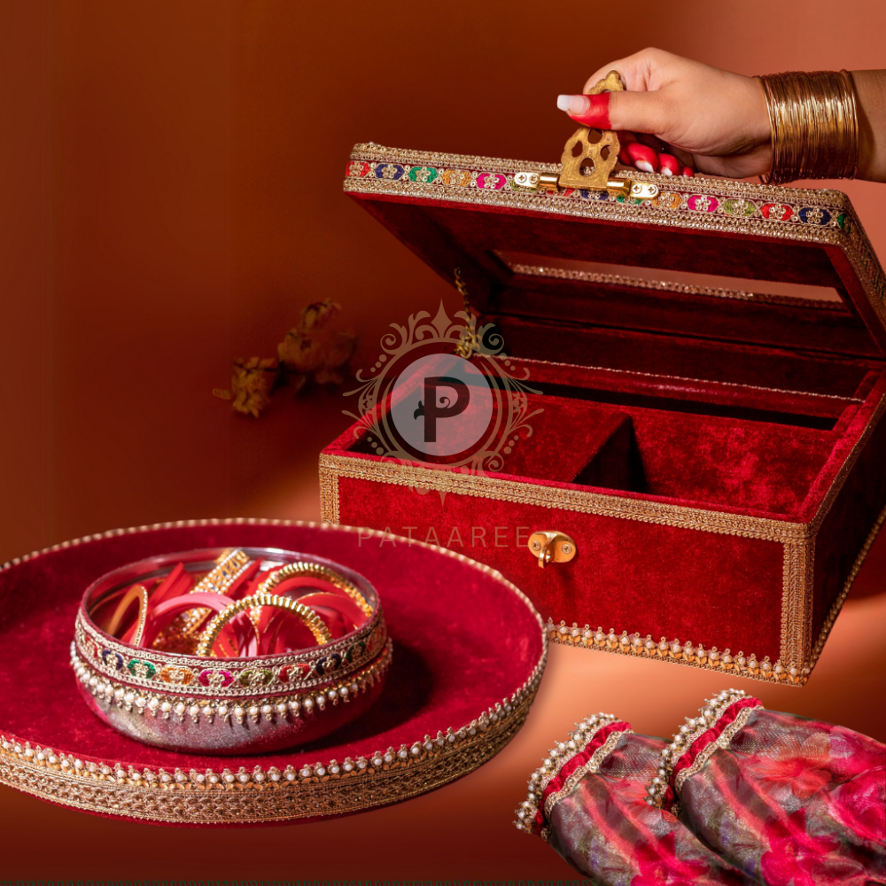 It’s your Chura ceremony, and you deserve nothing but the best—just like Pataaree’s Surkh Chura essentials! Our bestselling Surkh Chura Ceremony Set has everything you need, all in one beautifully curated set. It includes a stunning maroon Chura Kaleera Box to keep your wedding chura and kaleera safe, a matching thaal with a chura bowl for dipping in milk during the ceremony, and elegant maroon chura covers with floral hues to preserve your chura until your bridal look is complete. Simply add it to your cart, and we’ll take care of the rest, ensuring your ceremony is unforgettable!