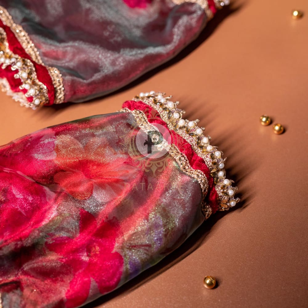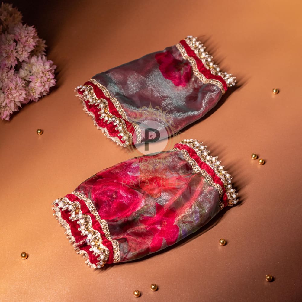 Crafted with floral fabric and maroon tissue, highlighted by intricate bead and gota work, these chura covers bring elegance to post-ceremony traditions. Elasticated ends provide a secure fit, making them perfect for covering and protecting the chura after the ceremony.