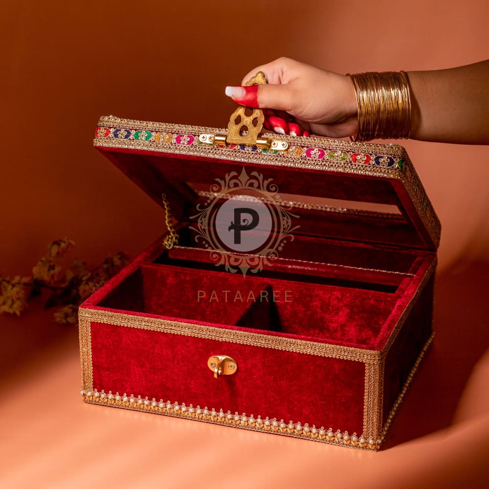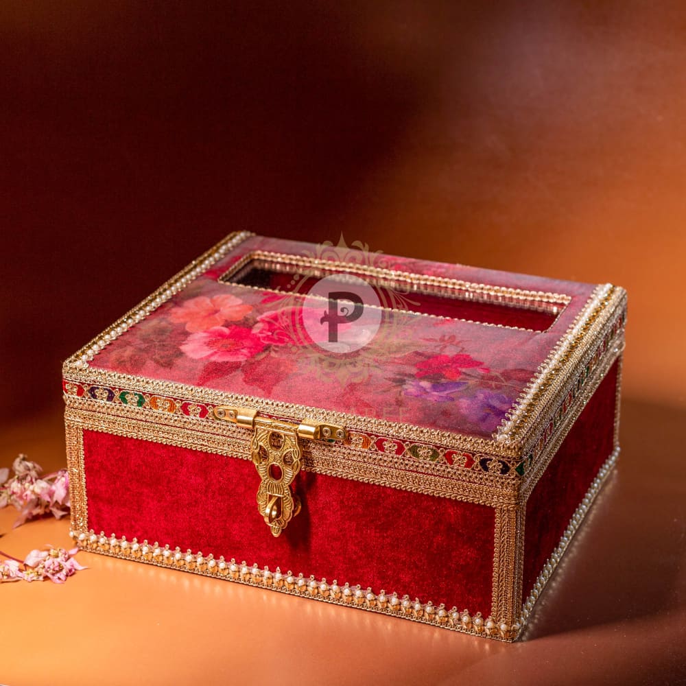 This keepsake box, wrapped in maroon tissue over floral fabric with bead and gota accents, is lined with maroon velvet. It’s perfect for storing wedding chura and kaleera, ensuring these treasured pieces remain beautifully preserved as part of your trousseau essentials.