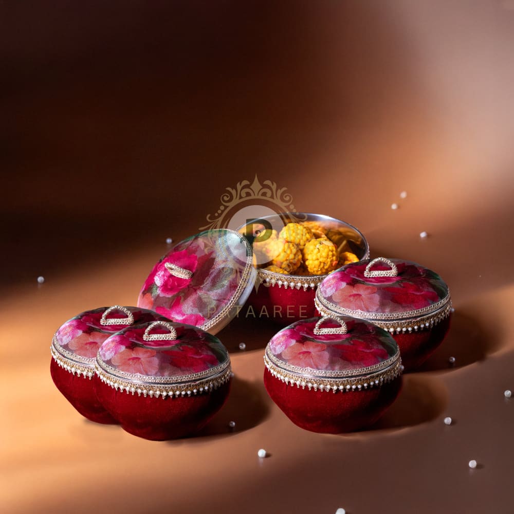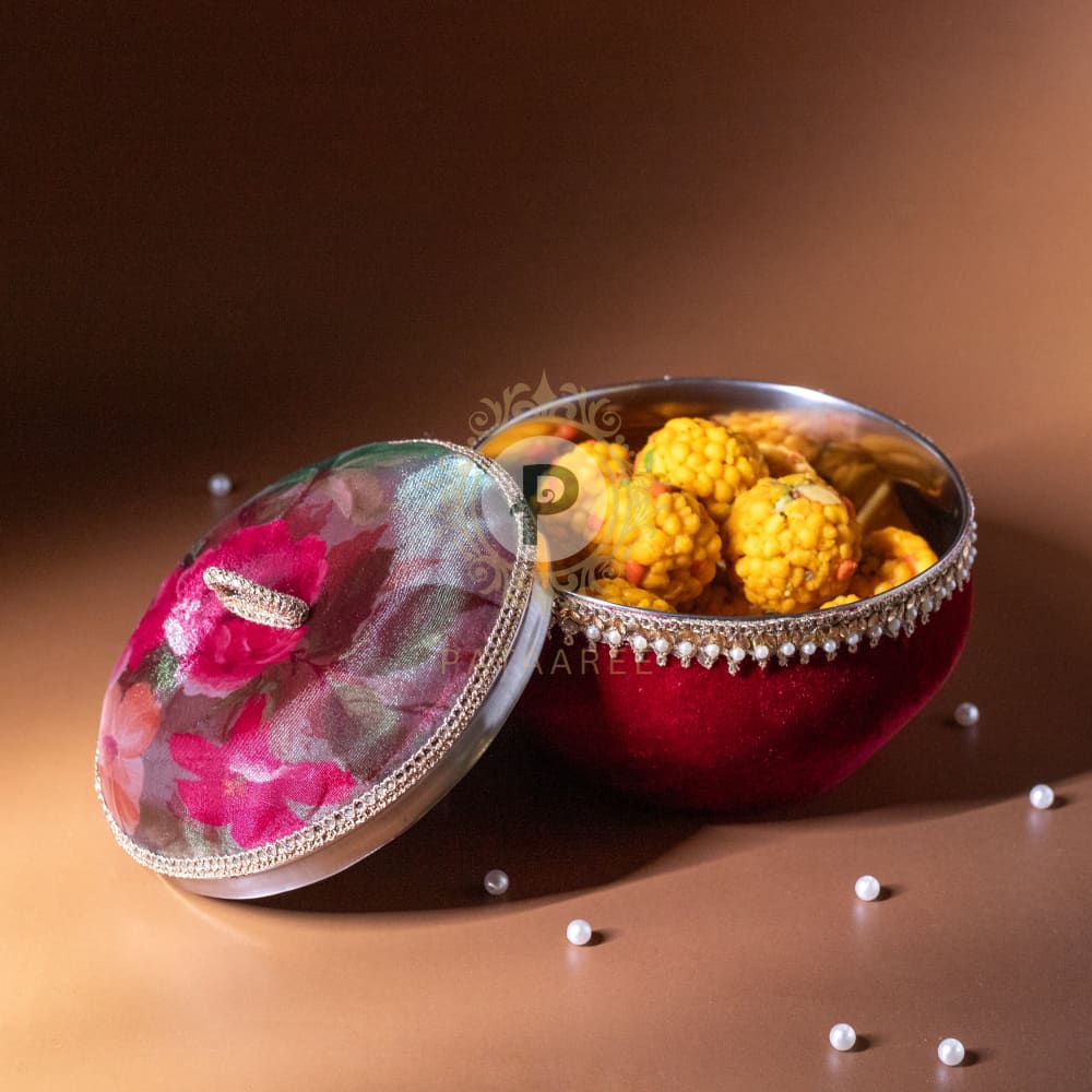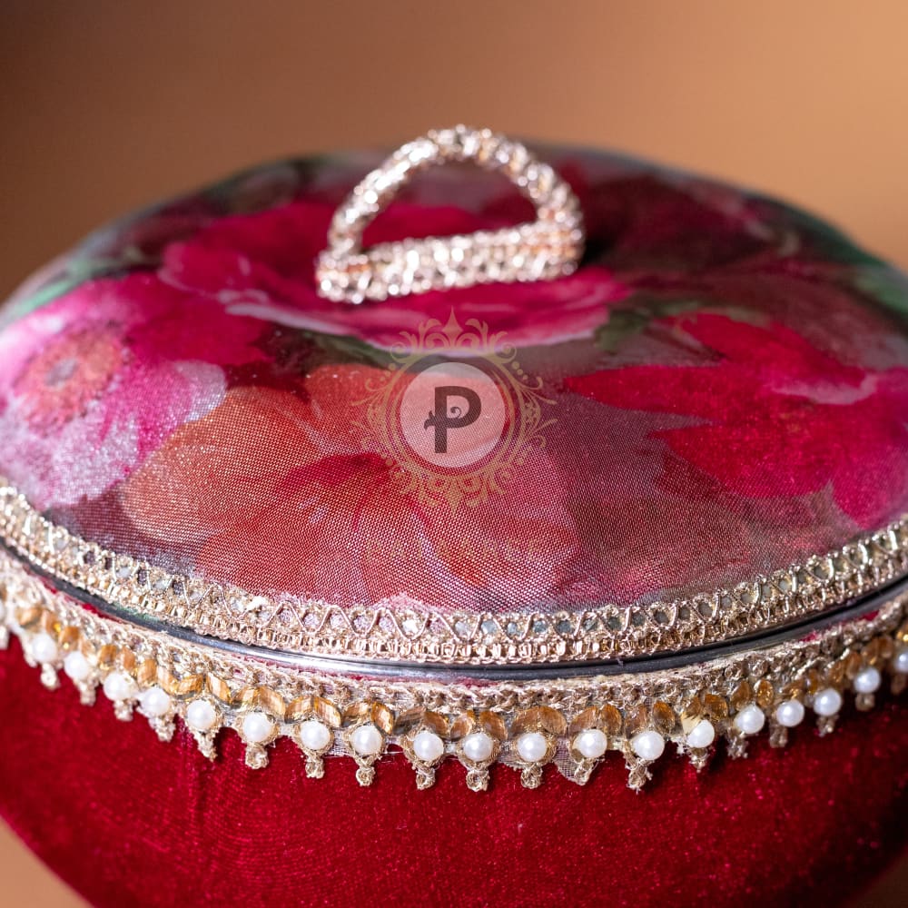 The Surkh Ladoo Box is the perfect addition to your Shagun ceremony or wedding essentials. Covered in floral fabric with maroon tints, matching gota work, and delicate beads, it’s an elegant and traditional way to present mithai during special celebrations. Perfect to keep 1 kg mithai or dry fruits