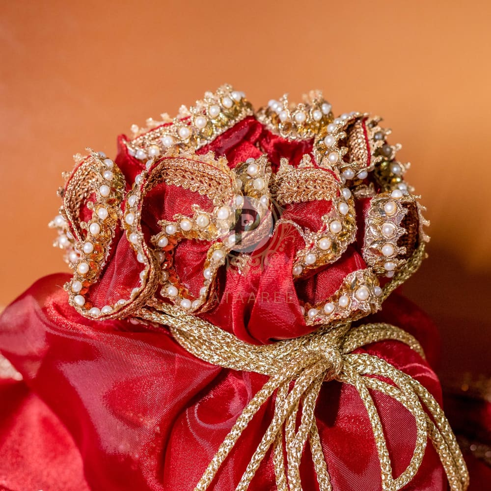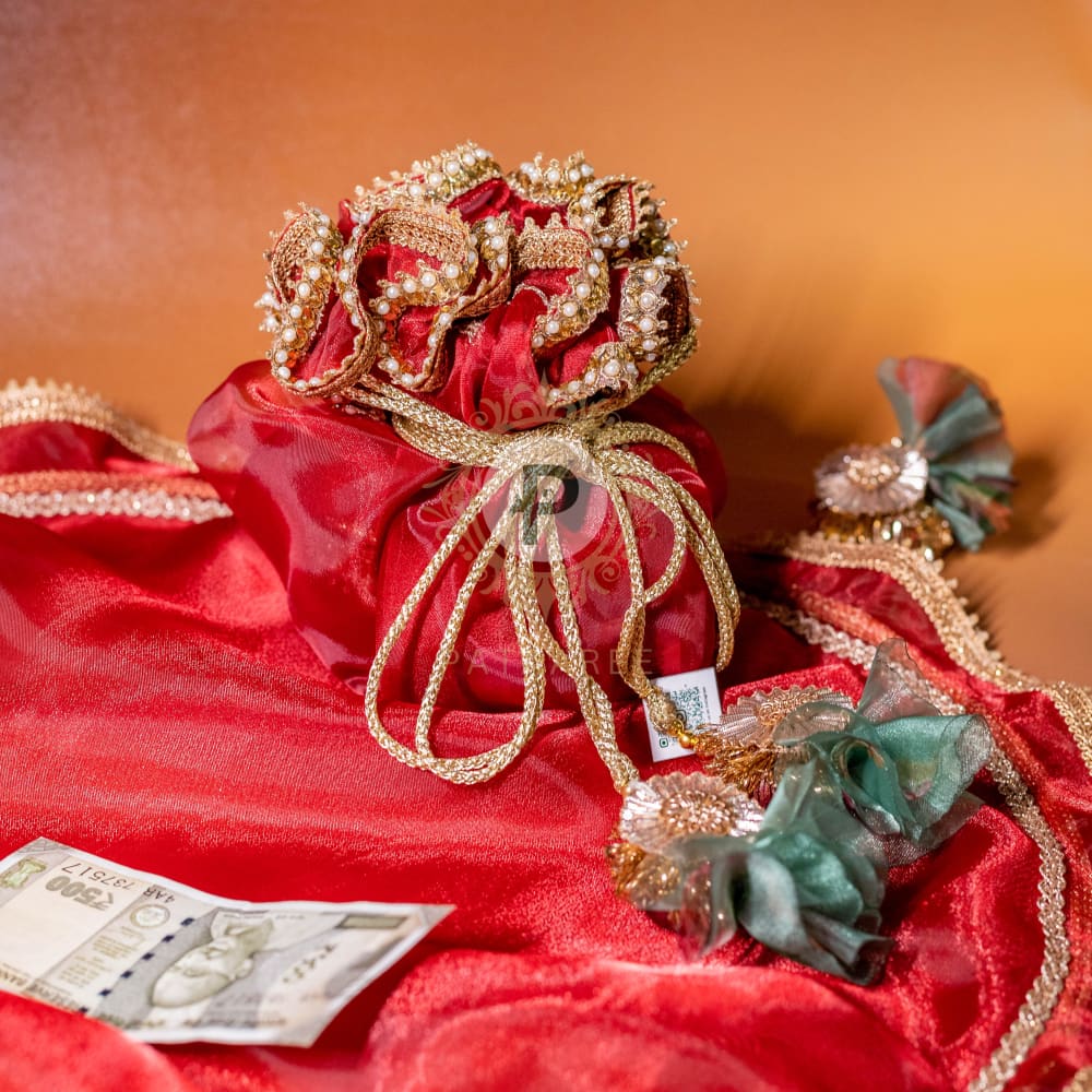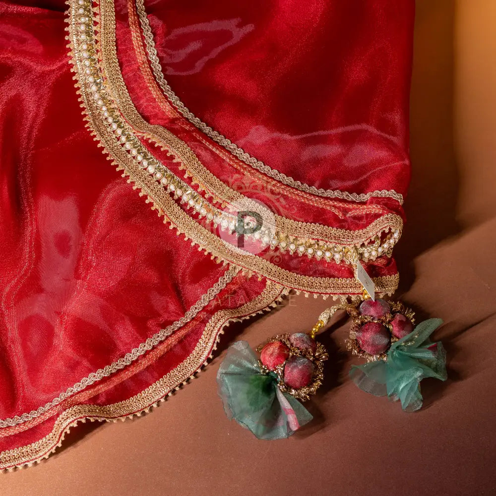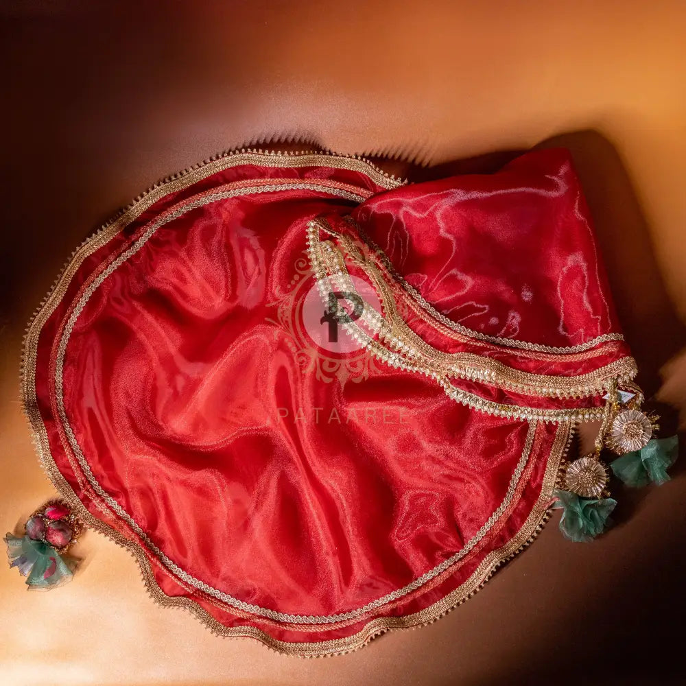 From the Surkh collection, this luxurious lap cover pair is made in deep maroon tissue with gold detailing and teal green floral pompoms. A stunning addition to your Shagun bags, perfect for enhancing your wedding/shagun ceremony.