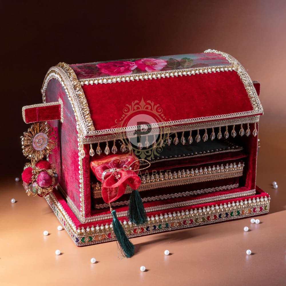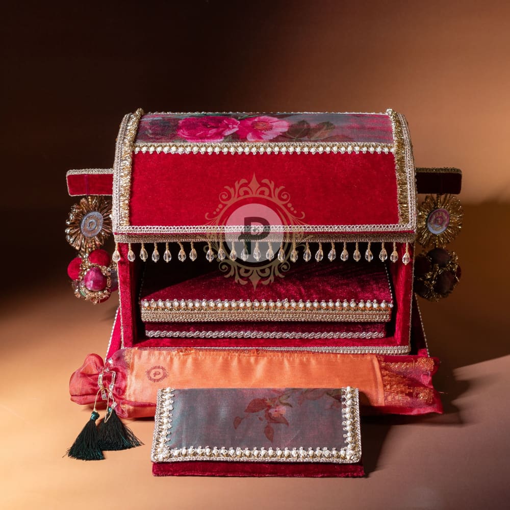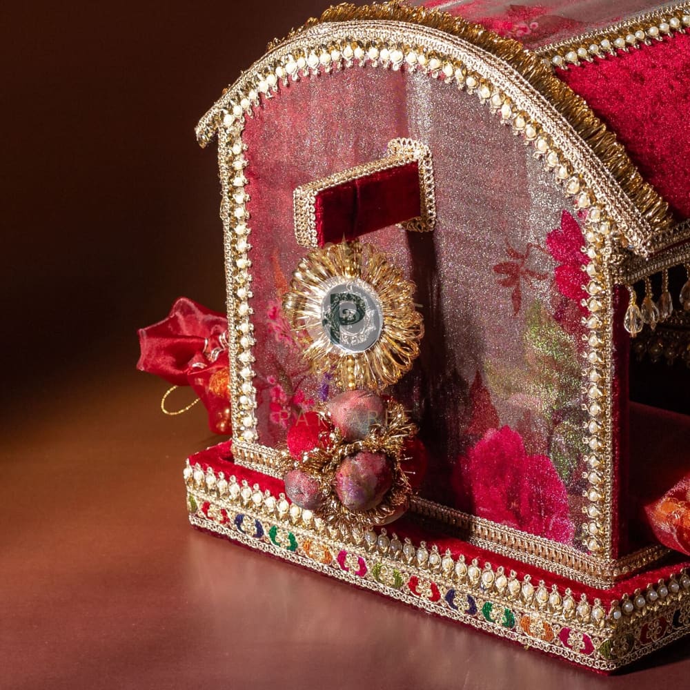 Vibrant and bold, the Surkh Palki makes a stunning statement for the Sahe Chithi. Crafted in rich velvet with mirror work, it mirrors the joy and sparkle of the occasion. The mithai box brings sweetness, the scroll shares your message, and the Shagun envelope carries heartfelt blessings from one family to another.
