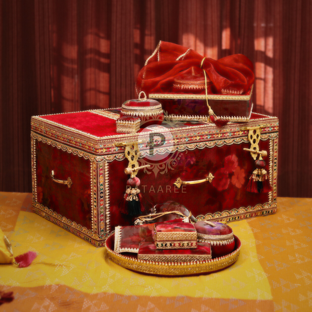 A makeup vanity for gifting bangles or makeup to the bride, a small hand mirror, and a collection of elegant jewelry boxes—Chain box, Ring box, Single Kada box, Double Kada box, and a Jewelry box to store a set. We’ve also included a mini trunk for the dupatta or other small items, 3 suit/saree covers, and a larger trunk to keep it all together.