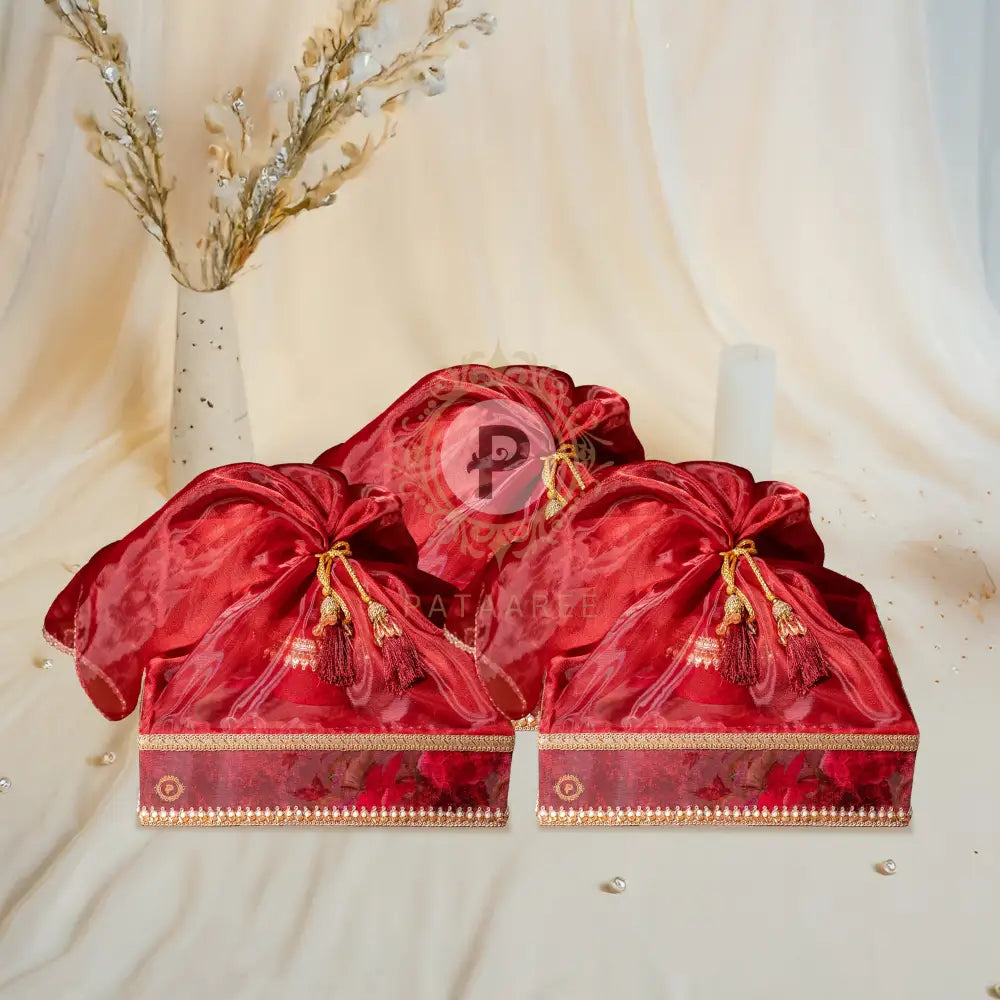 The Surkh Tray Tissue Basket is designed with floral fabric in maroon tones, complemented by gota work, beads, and a maroon tissue cover with elegant tassels. Ideal for your Shagun ceremony, wedding trays, or hamper gift baskets, it renders a spellbinding effect to any celebration.