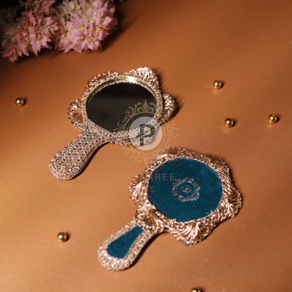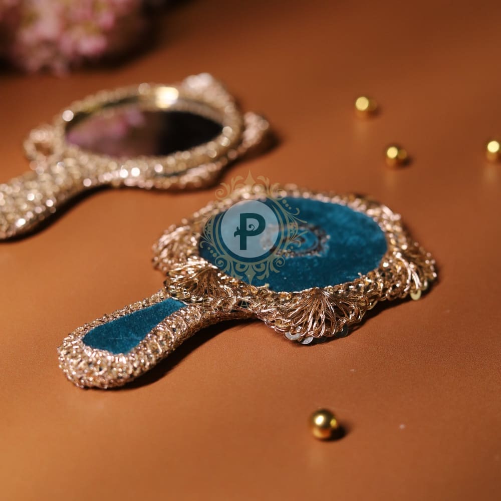 Encased in lush teal blue velvet with refined accents, the Teal Grace Hand Mirror brings sophistication to any occasion. Ideal as a wedding favor, Shagun gift, or Mehendi keepsake, this mirror adds a refreshing pop of color to your celebrations. A unique fusion of elegance and practicality, it's a beautiful companion for vanity tables or bridal gift hampers, making it a treasured and memorable token.