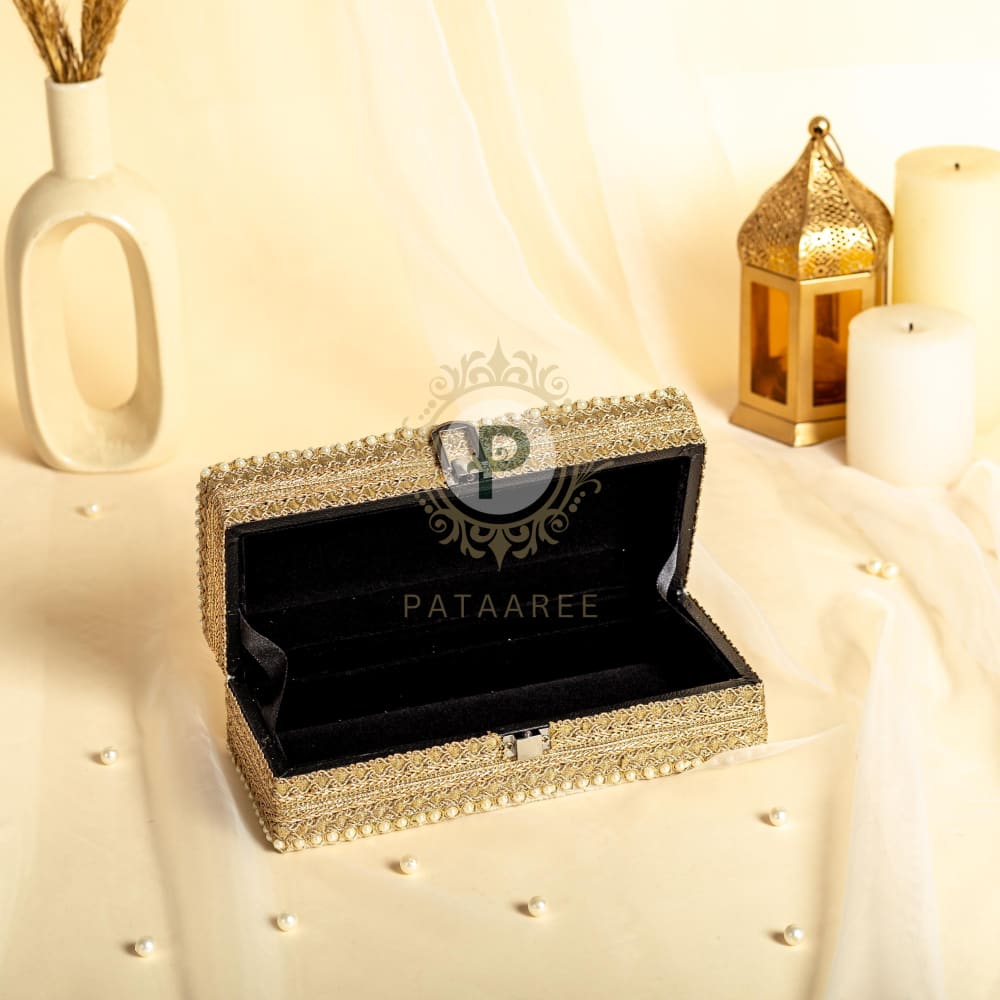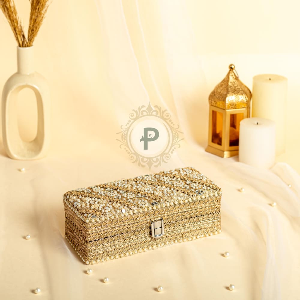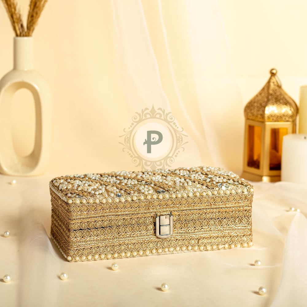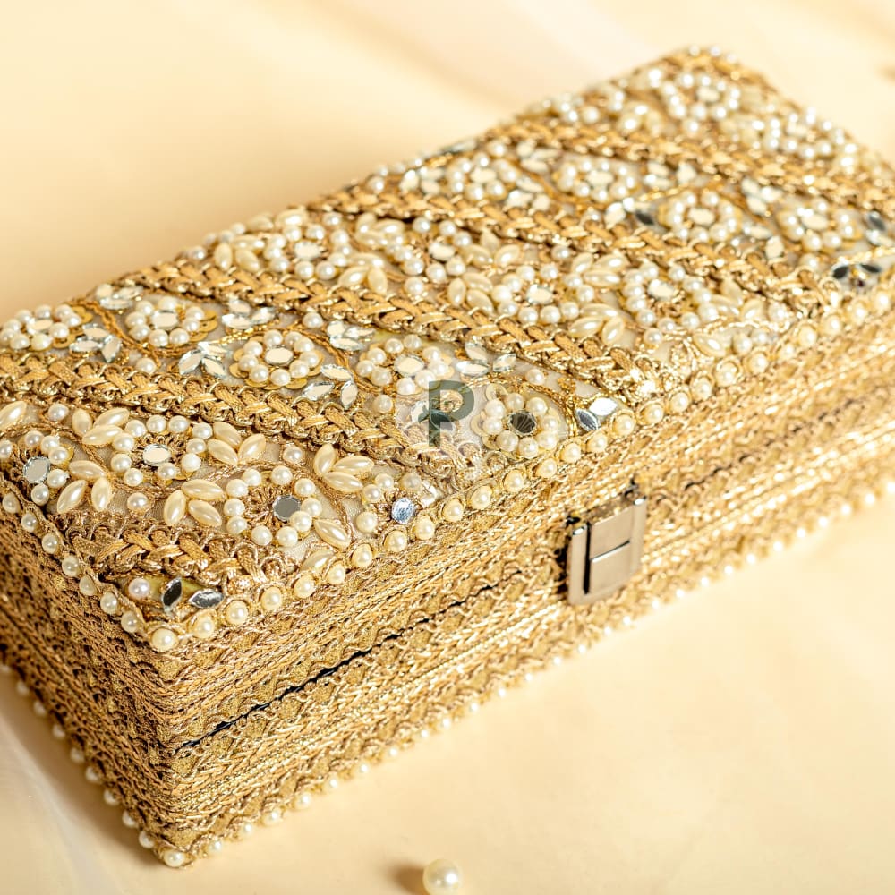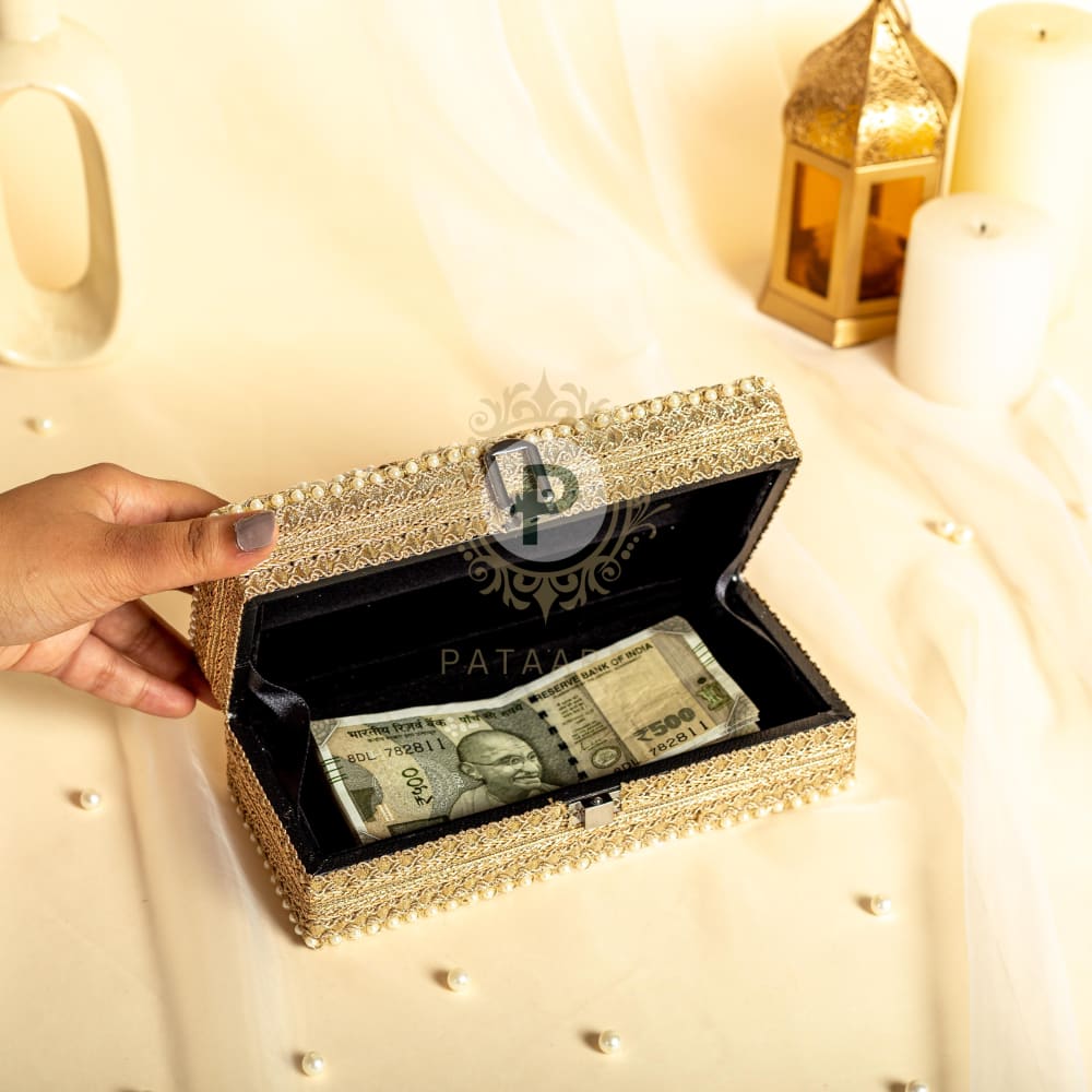 For that generous amount of Shagun, or a fat gift in cash, instead of envelopes go for the Zehra collection cash box, a gorgeous little rectangle shaped case with pearl and mirror dabka work, black lining and a clasp to lock it.