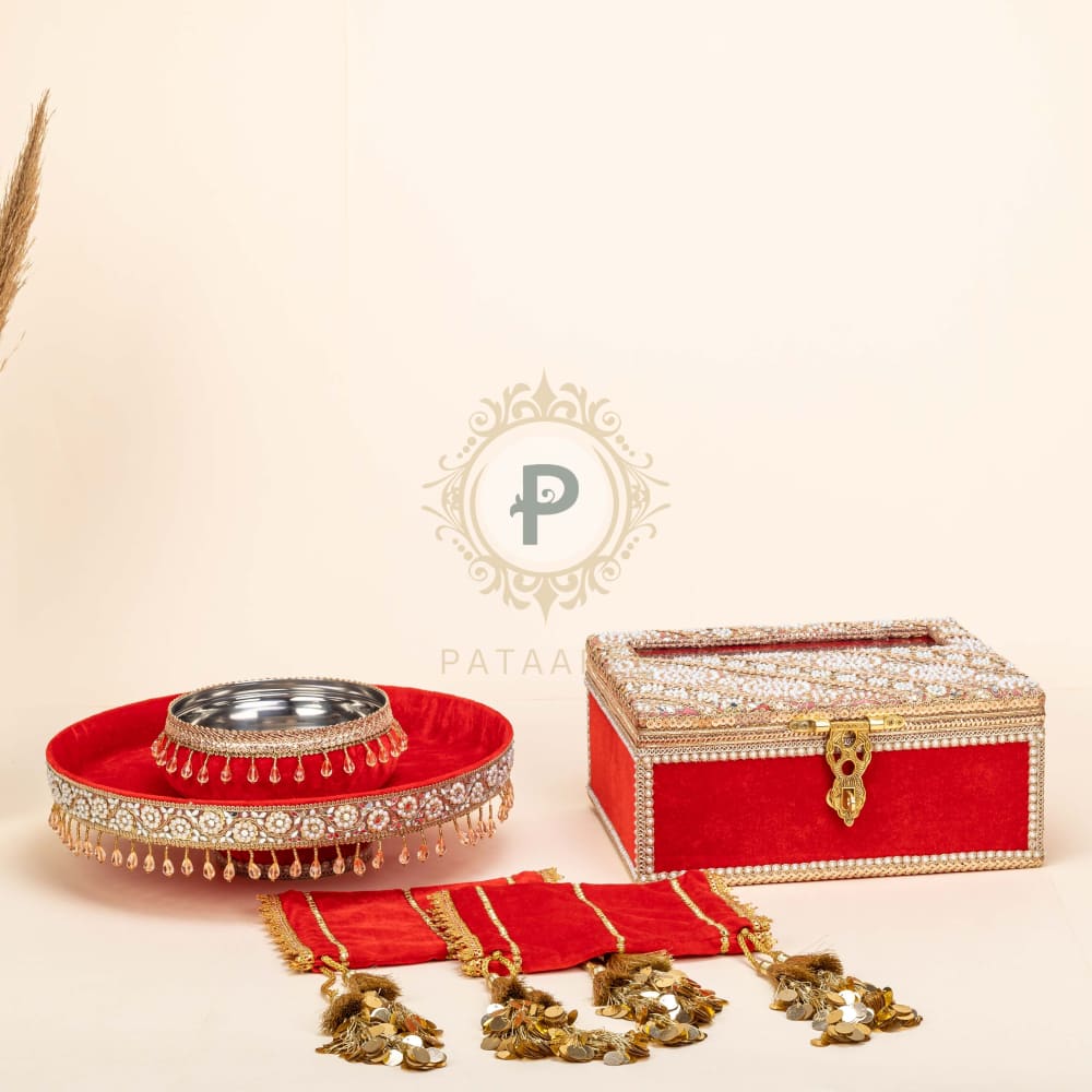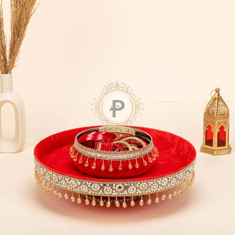 It’s your Chura ceremony, and you deserve nothing but the best—just like Pataaree’s Chura essentials! Our bestselling Chura Ceremony Set brings everything you need, all in one place. The set includes a beautiful Chura Kaleera Box to keep your wedding chura and kaleera safe, a thaal with a chura bowl for dipping in milk during the ceremony, and elegant chura covers to preserve your chura until your bridal look is complete. Add it to your cart and let us take care of the rest, making your ceremony truly unforgettable!
