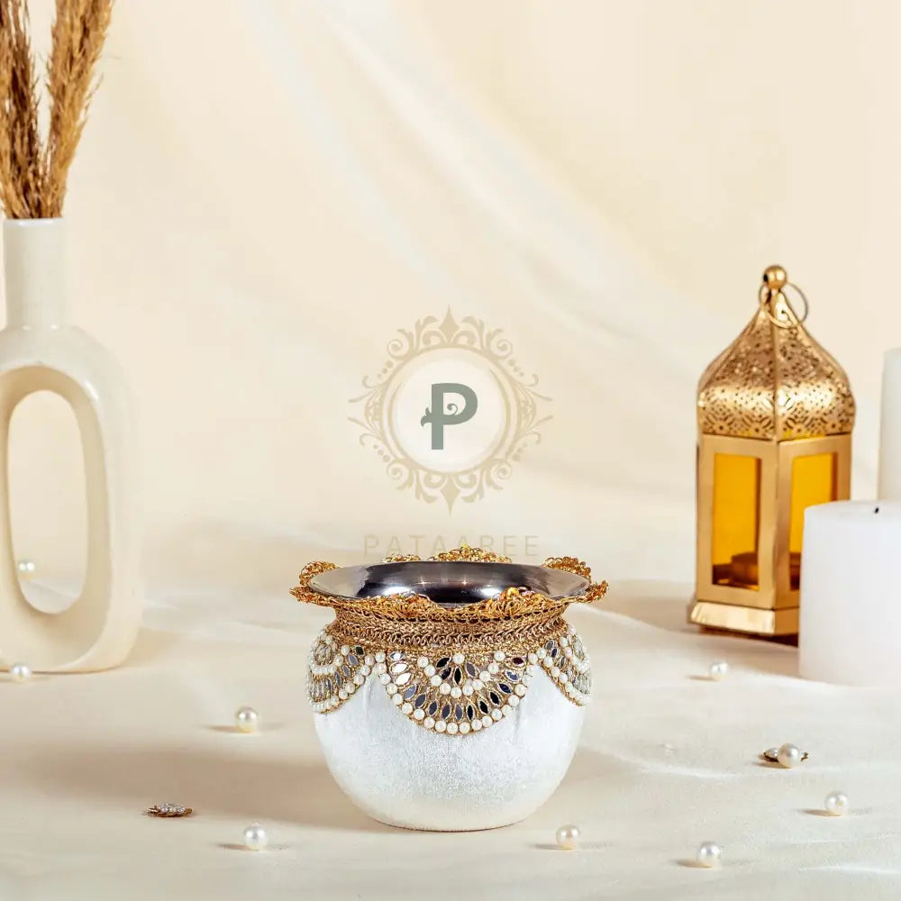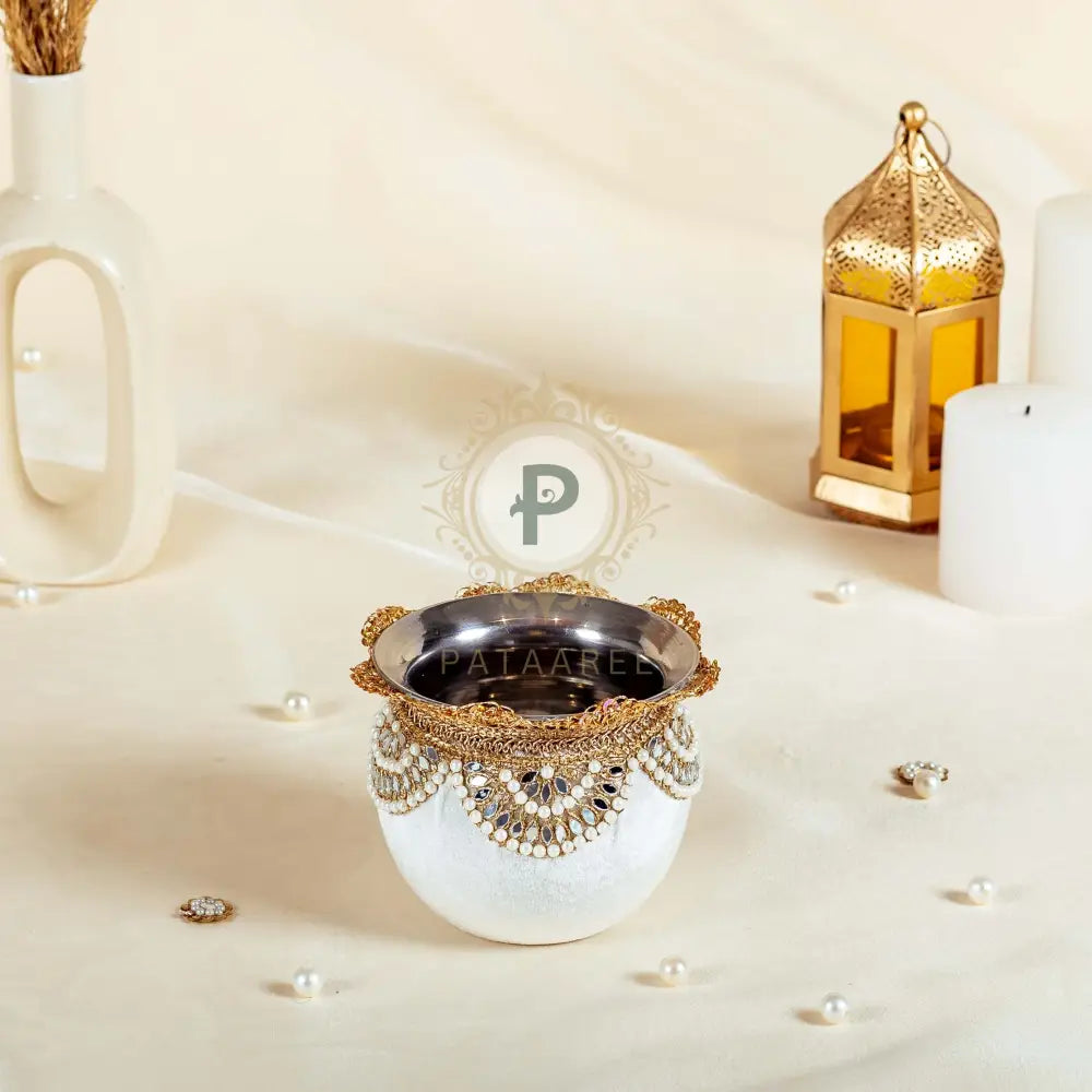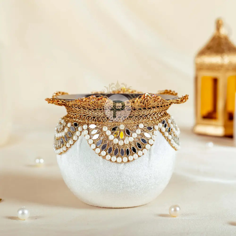 Looking every bit dazzling and festive is our Zehra collection Gadvi, with its pearl and mirror dabka work and gold trims. The gadvi is a wedding/shagun essential item, finding its way into haldi, mehndi, welcoming the new bride - almost all rituals. Go ahead, order your now!