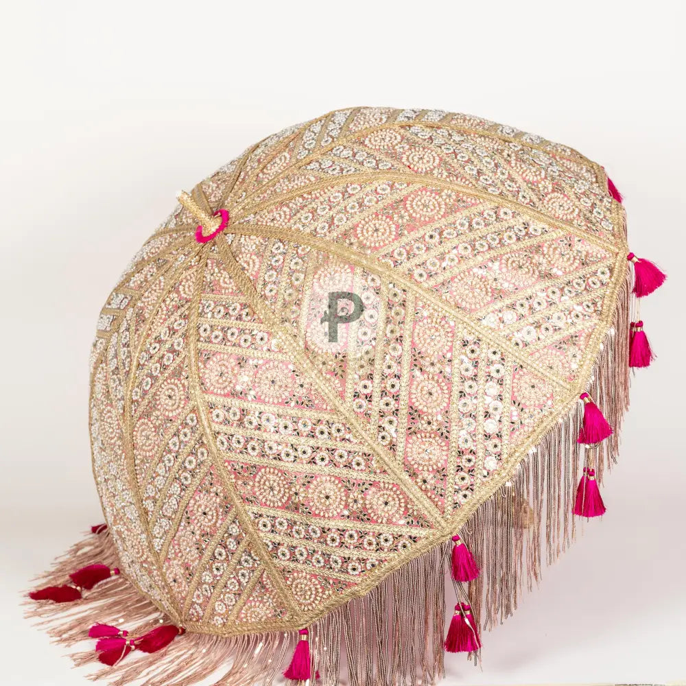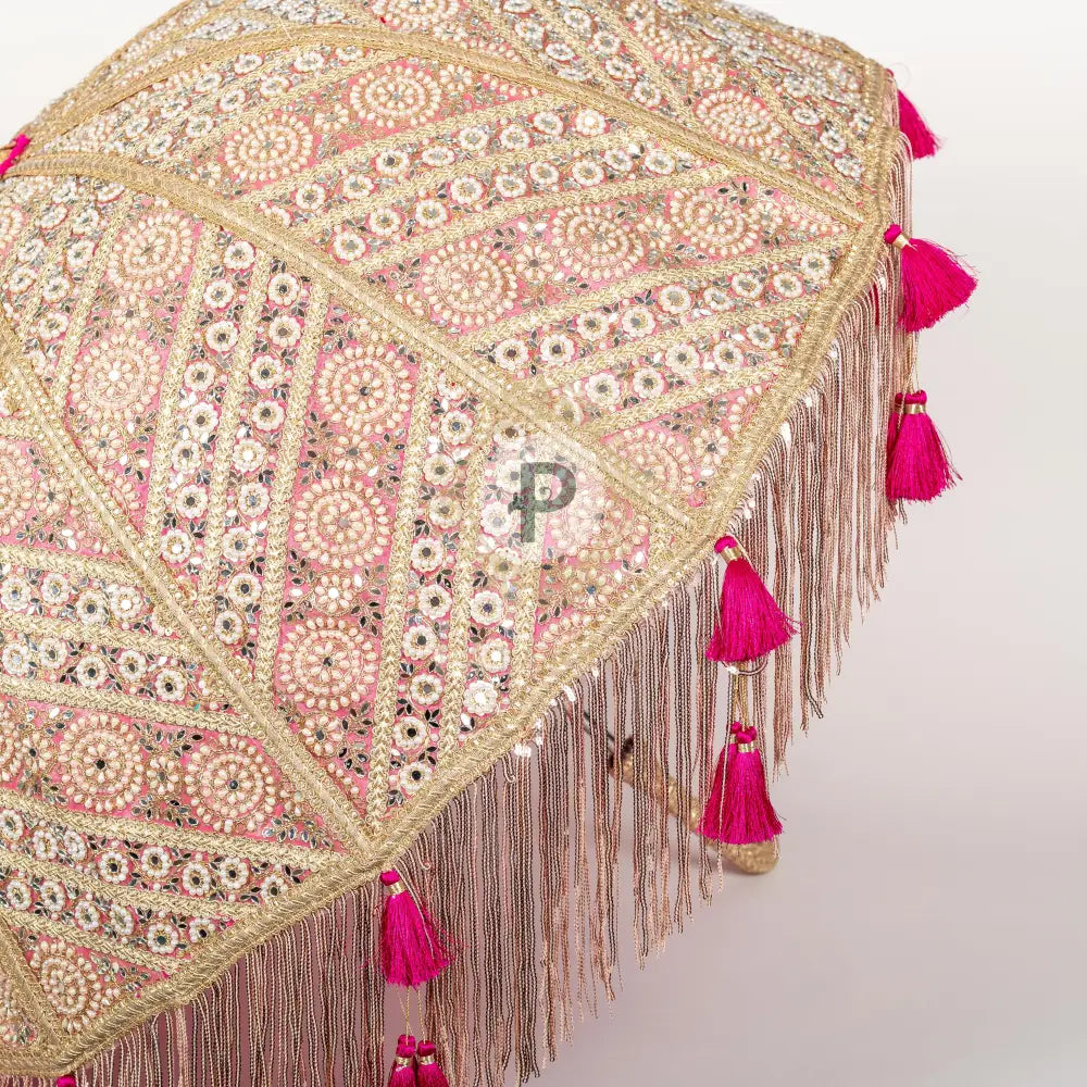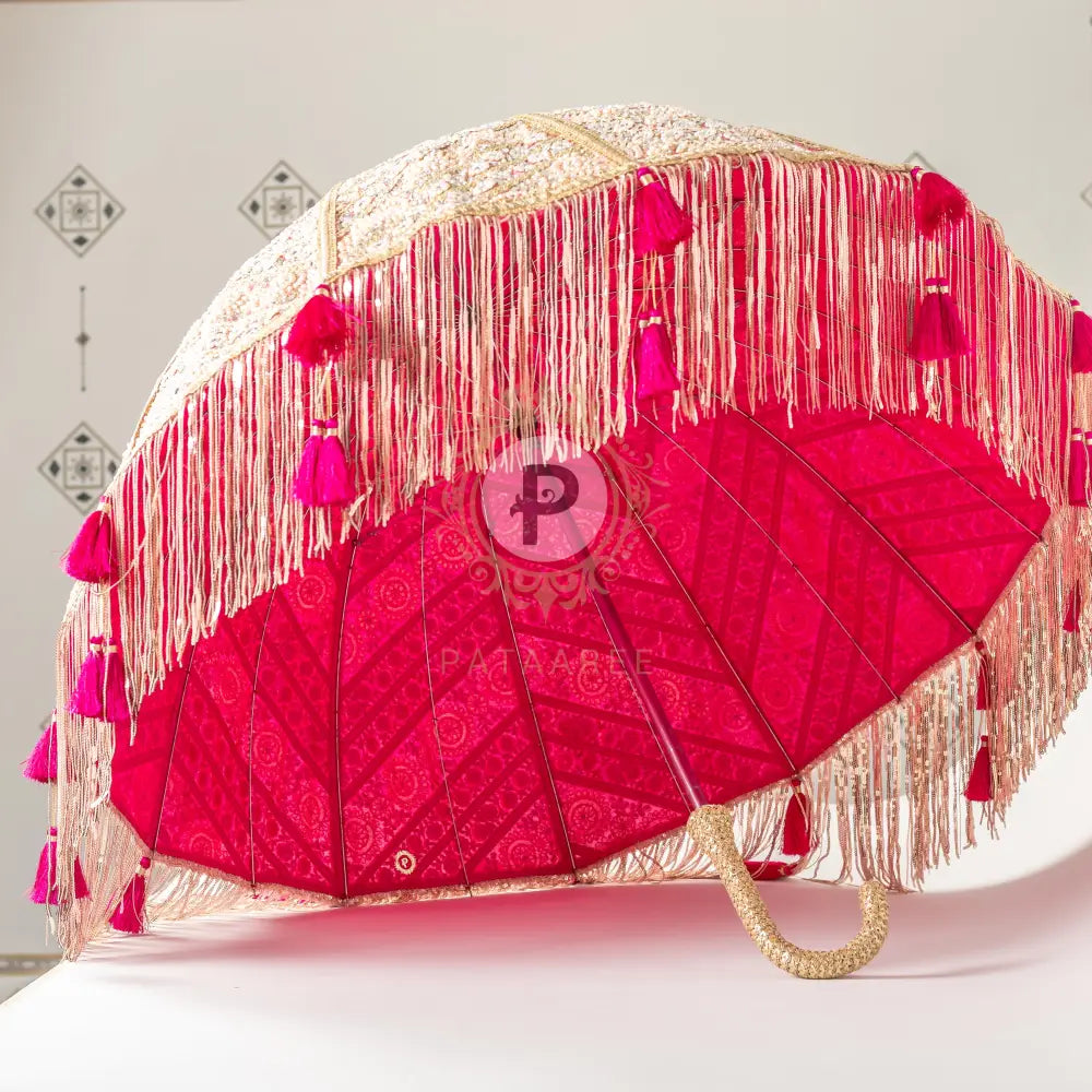 Make your wedding ceremony unforgettable with our elegant bridal entry umbrella with tassels in hot pink color. Adorned with delicate pearl and mirror work, complemented by matching fringes and tassels, this beautiful accessory adds grace and charm to any bridal or groom entry. Capture every moment in style with this exquisite statement piece.