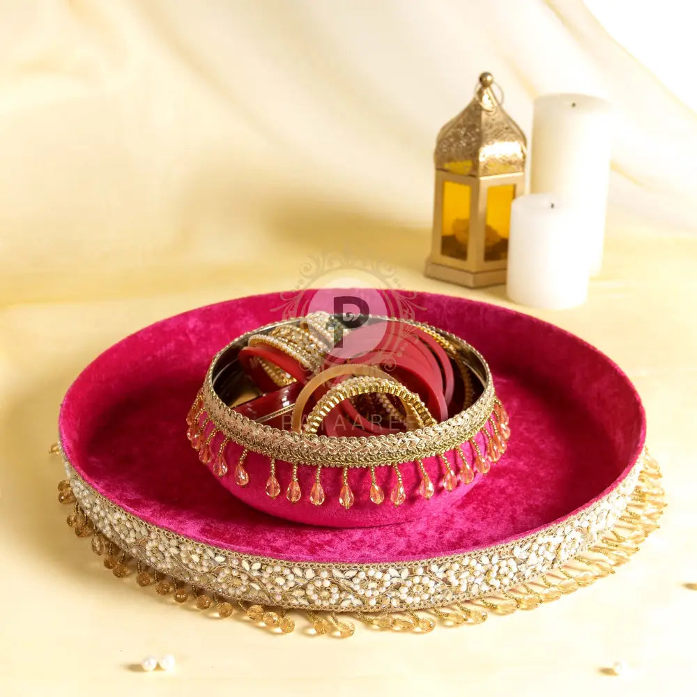As the bride-to-be receives her chura, the chura ceremony brings together cherished family traditions. Add a pop of vibrant hot pink with the Zehra collection thaal, which includes a large matching bowl to cleanse the chura in milk or kachi lassi, making this event even more unforgettable.