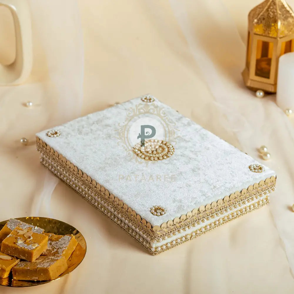 Matching the bhaji box is the barfi box, trading its plain cardboard look for an elegant ivory and champagne gold finish from the Zehra collection. An essential in shagun and wedding rituals, the barfi box is perfect for presenting sweets with invites or as a thoughtful wedding gift.