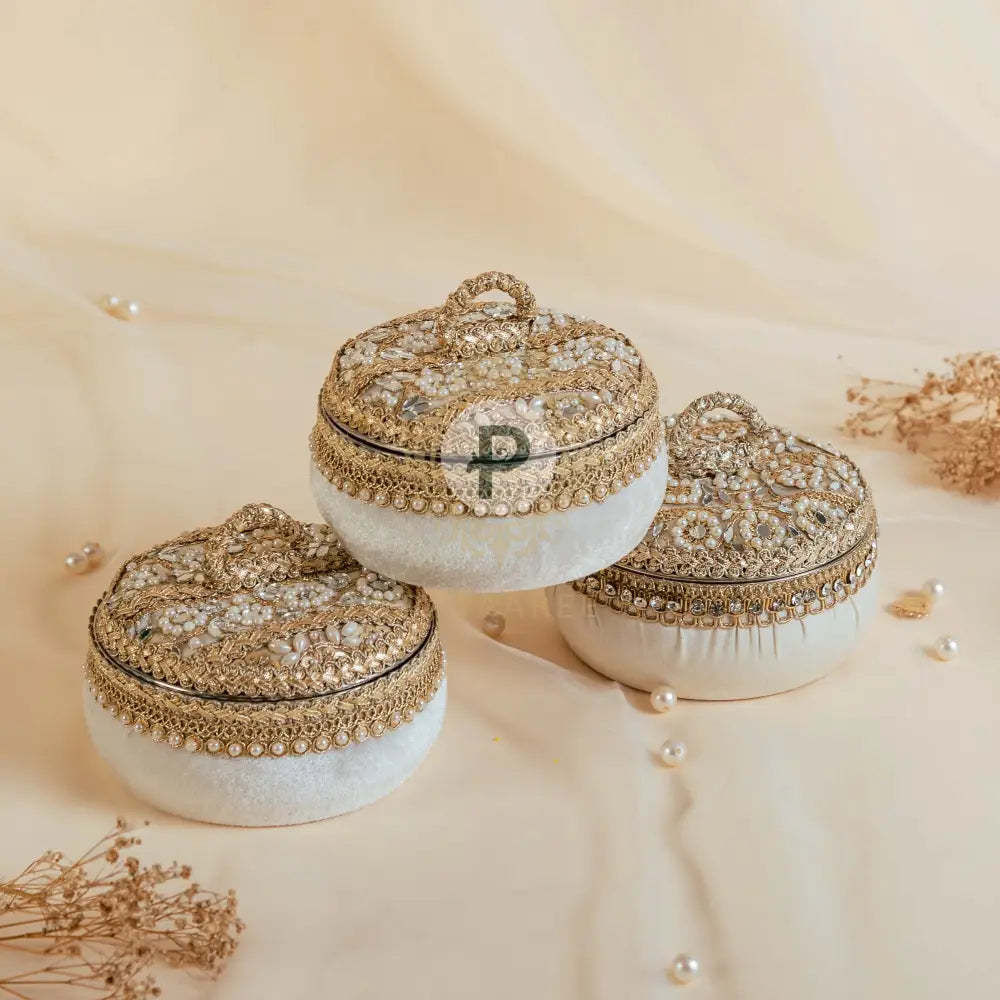 Wrapped in ivory coloured velvet fabric, the small laddoo boxes leave a sweet impression with exquisite pearl, mirror and bead dabka work, and can hold your small sweets like panjiri and dry fruit for Shagun ceremonies and gifting.