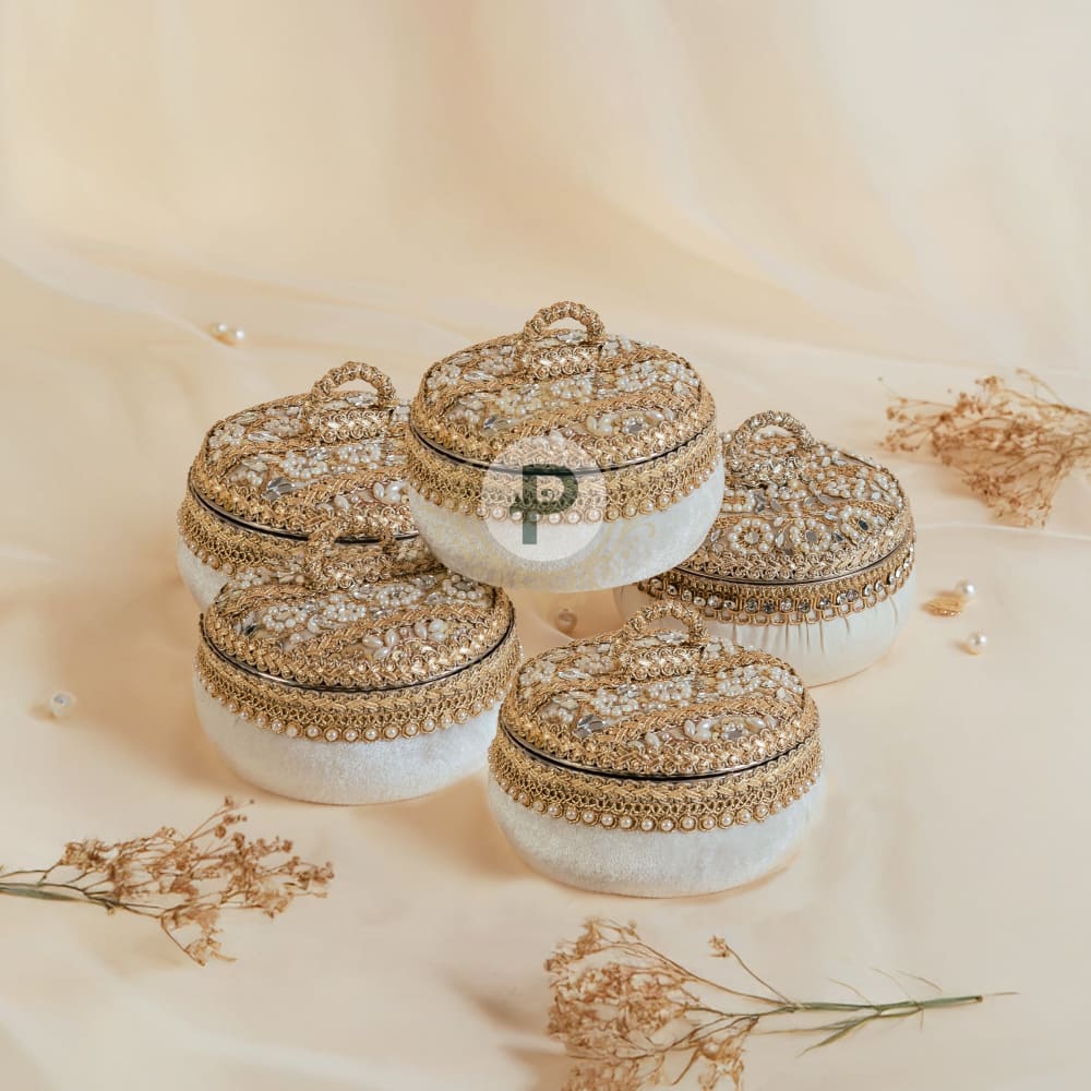 Wrapped in ivory coloured velvet fabric, the small laddoo boxes leave a sweet impression with exquisite pearl, mirror and bead dabka work, and can hold your small sweets like panjiri and dry fruit for Shagun ceremonies and gifting.