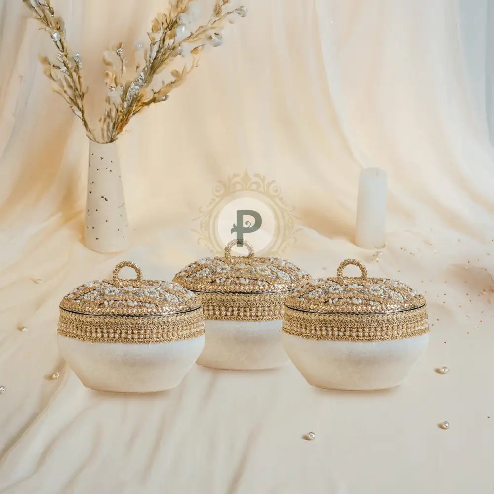 Wrapped in ivory coloured velvet fabric, the big laddoo boxes leave a sweet impression with exquisite pearl, mirror and bead dabka work, and can carry a sizeable amount of sweets, chocolates, dry fruit etc for Shagun ceremonies. The boxes can also be used for gifting at weddings.