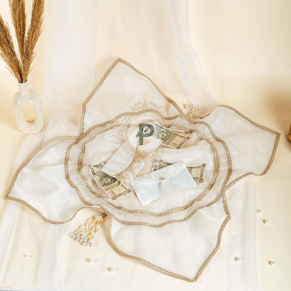 While beauty in design is paramount, at Pataaree we equally value functionality—crafting pieces that ease the load on wedding families, especially the bride and groom. The Zehra lap cover pair in ivory color is one such thoughtful creation—crafted from delicate tissue fabric with gold trims and drawstring doris, styled like a charming potli. Grace your shagun ceremony by collecting blessings and cash gifts on this exclusive handcrafted piece.