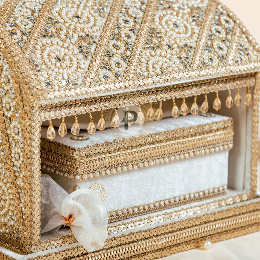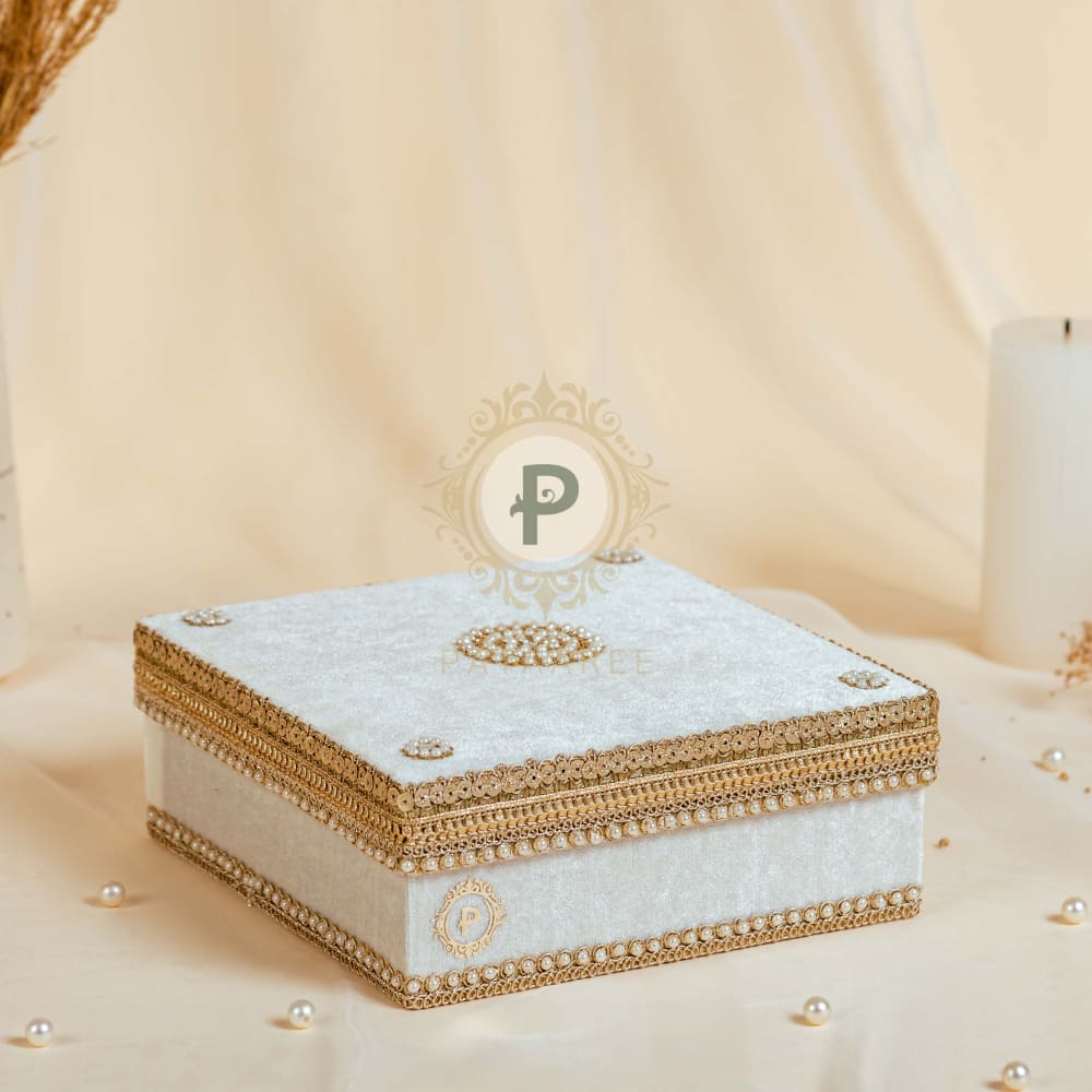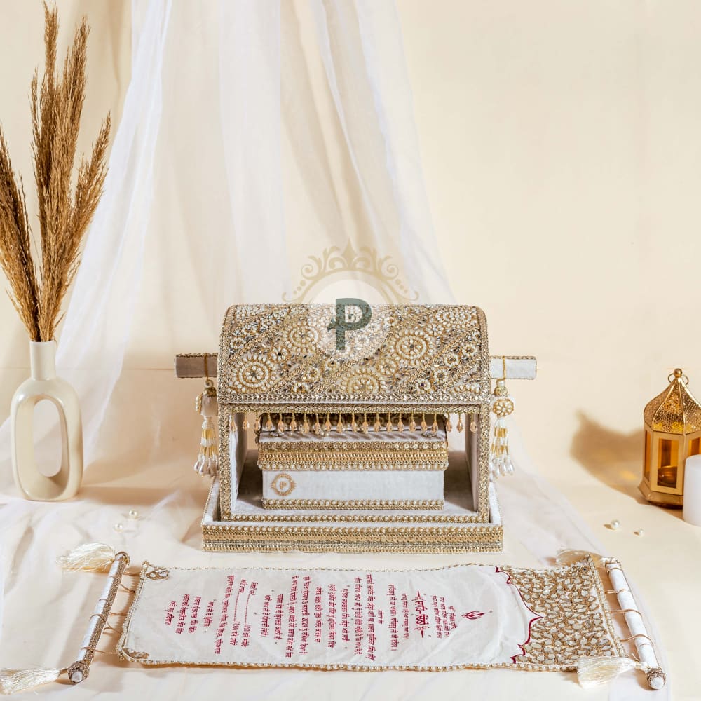 In soft ivory with delicate accents, this Zehra Palki brings simplicity and grace to the Sahe Chithi ceremony. The velvet speaks of love, respect, and tradition. A mithai box sweetens the moment, while the scroll becomes your voice, carrying every heartfelt word. The Shagun envelope hold blessings, wrapped with love and tradition.