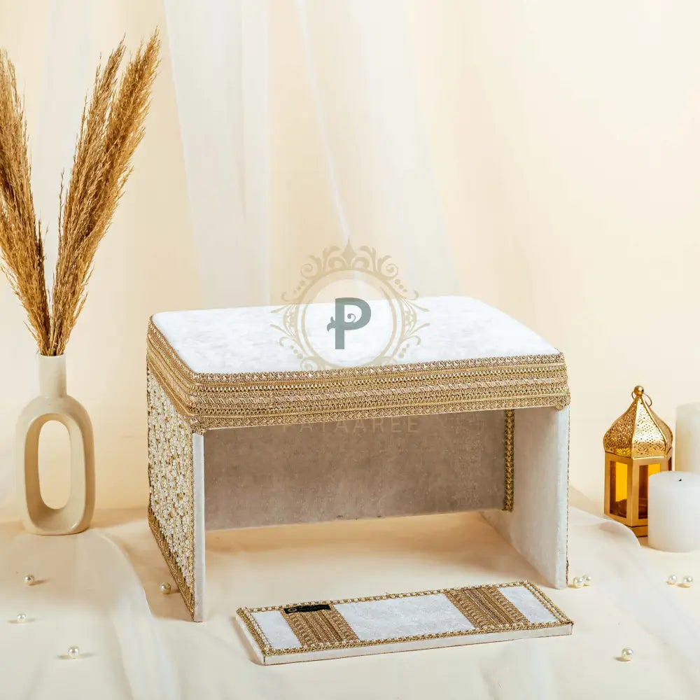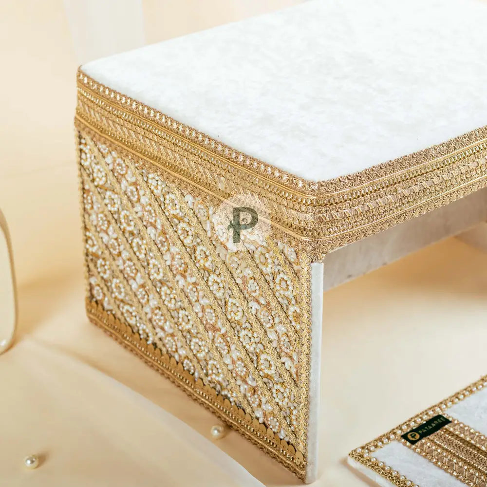 Grace meets tradition in this ivory peedi-fatti set from the Zehra collection, crafted to elevate your haldi ceremony with timeless charm, serene tones, and cozy comfort for your maiyan rituals.