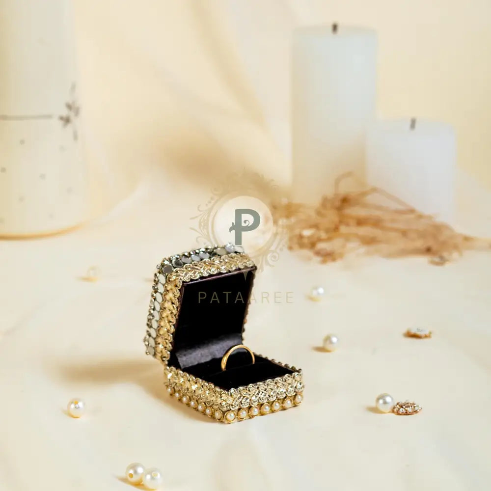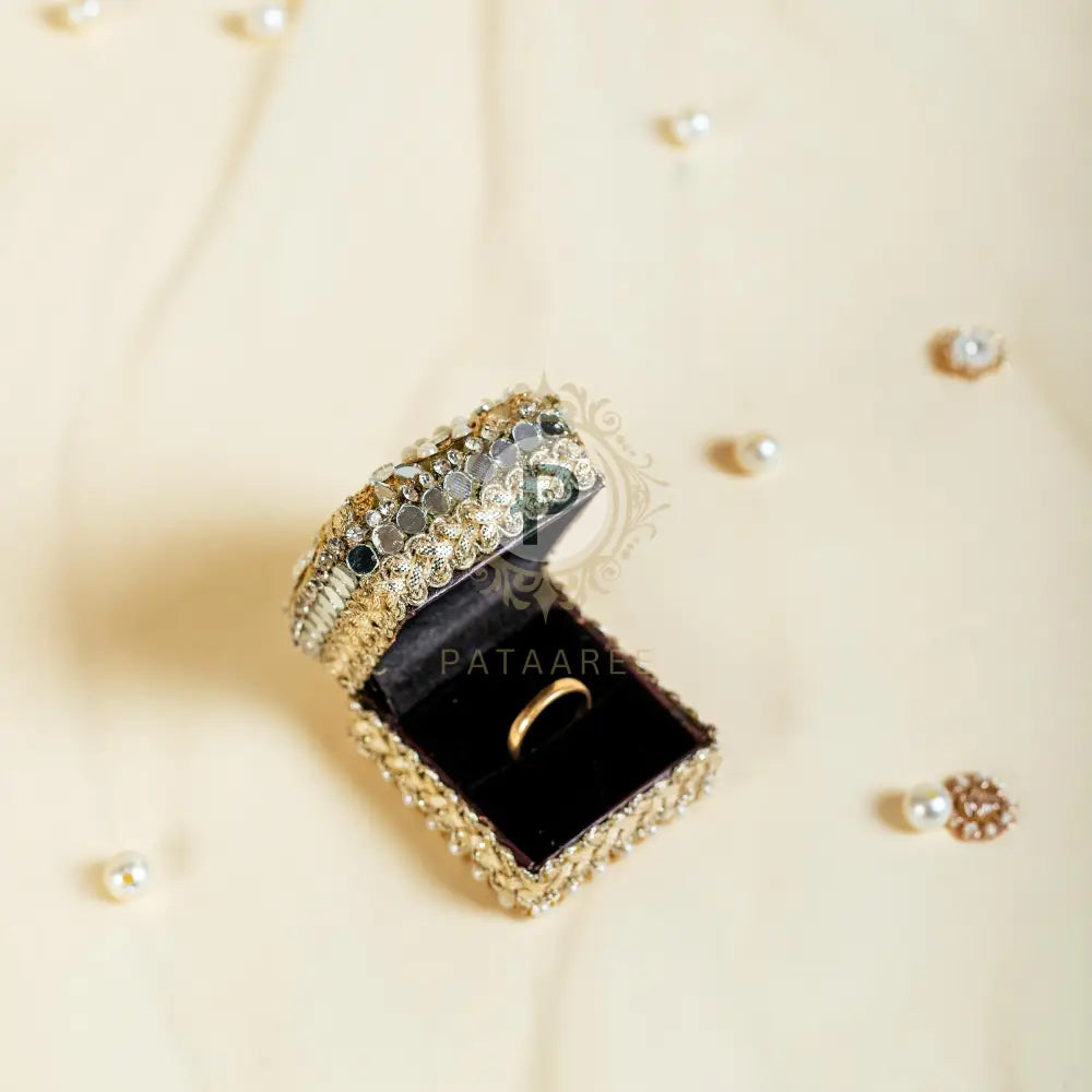 Adorned with gold trims, pearls, and mirror work, the Zehra ring box in ivory is delightfully ornate—perfect for Shagun, an elaborate proposal, or gifting during milnis.