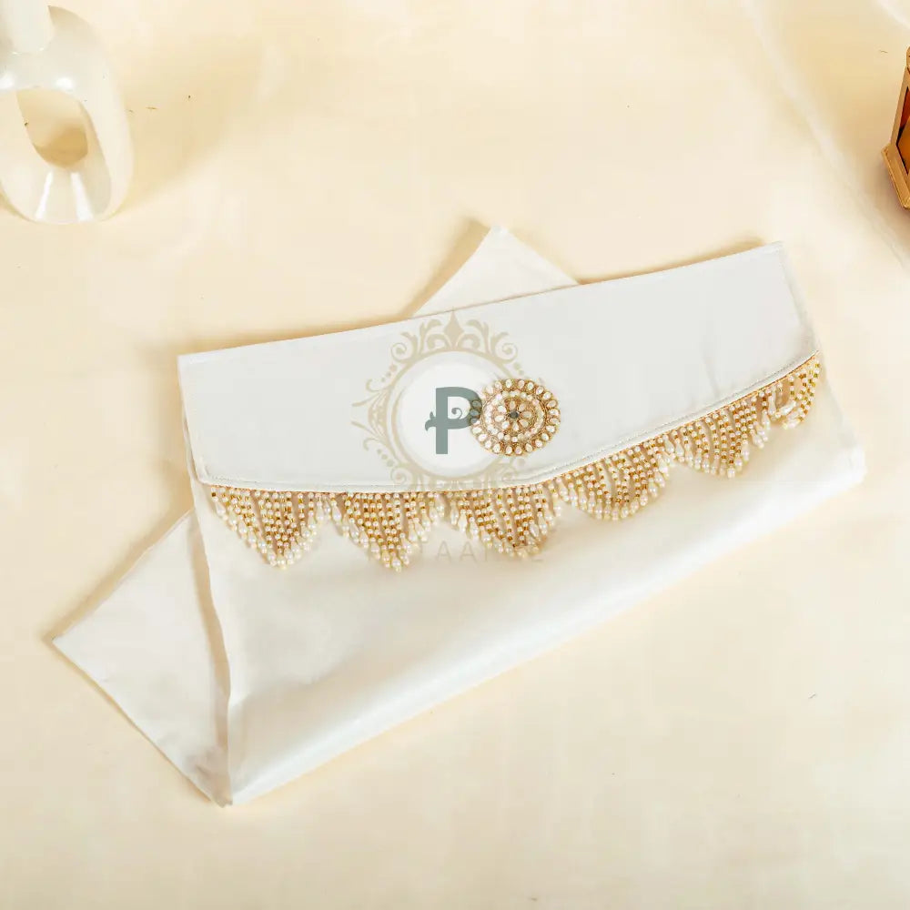 Material: Silk fabric flap on top with matching tissue and matching silk at back with embellished pearls and beads.