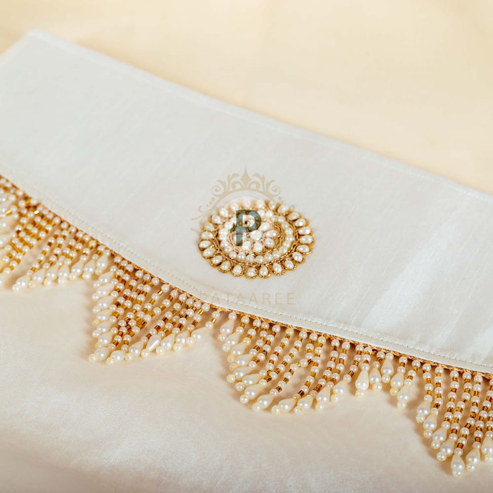 With pearl-bead tassels and the signature Zehra flower in pearls, this ivory cover exudes grace—a refined choice for bridal trousseau or special gifting.