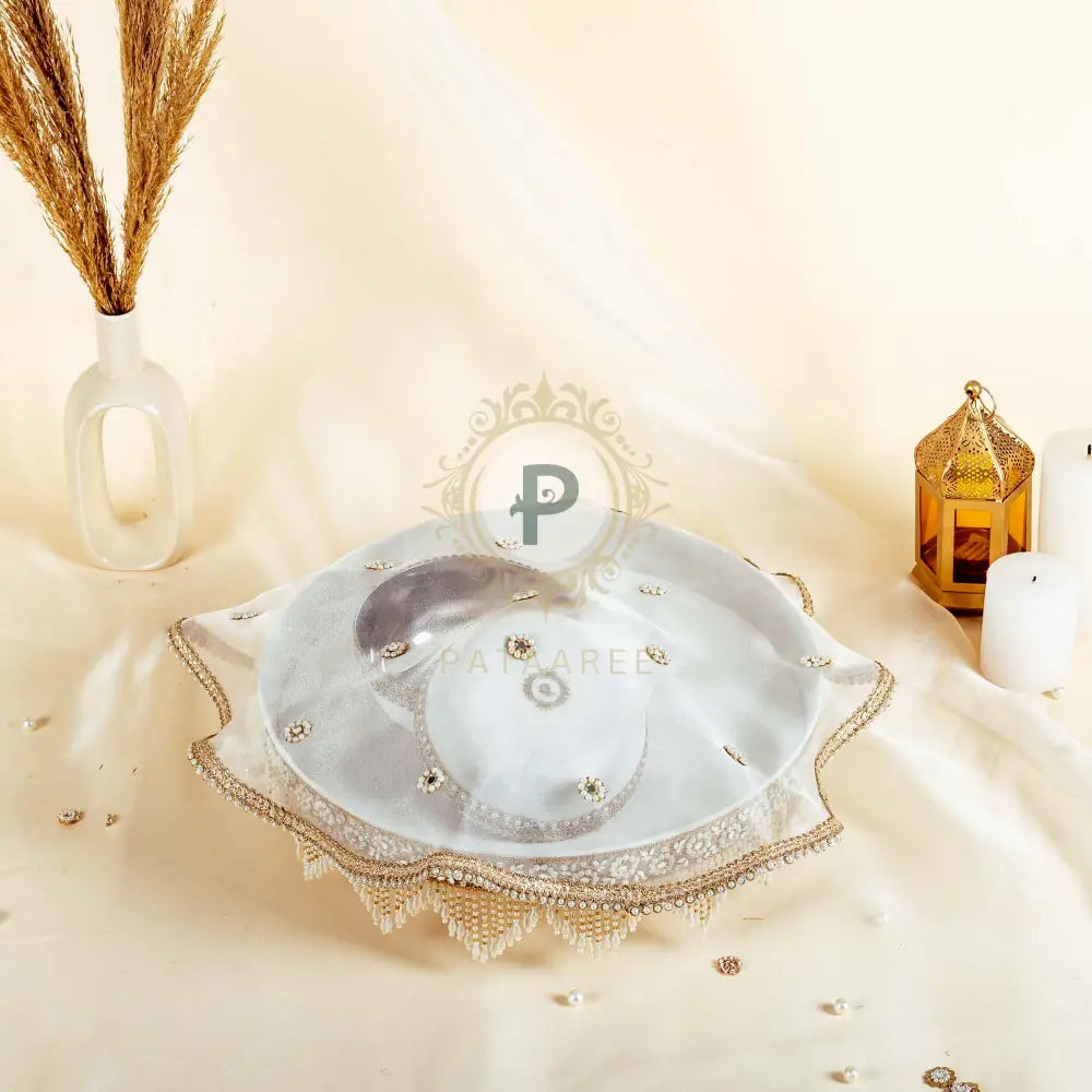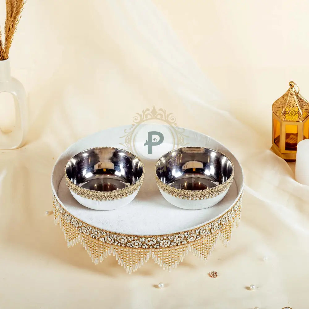 Celebrate the sacred haldi/maiyan ritual in timeless elegance with our ivory velvet thaal set. Gracefully adorned with soft beaded tassels, it comes with two matching pearl-trimmed bowls and a sheer tissue cover enhanced with champagne gold pearls—replacing ordinary kitchenware with ceremonial charm.