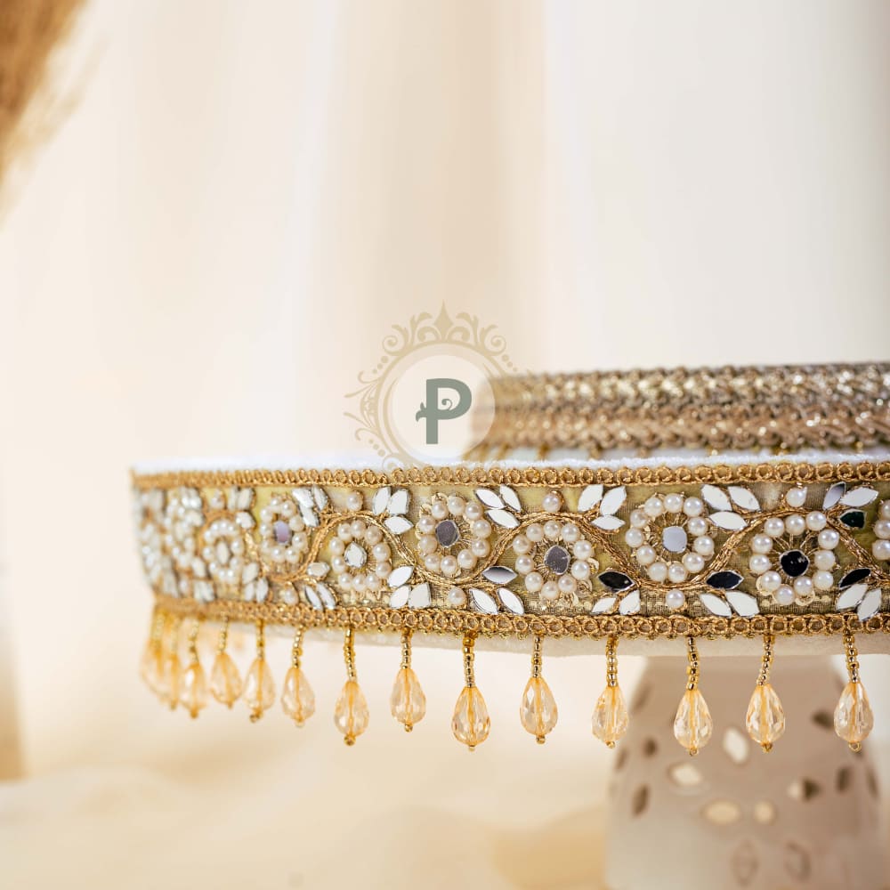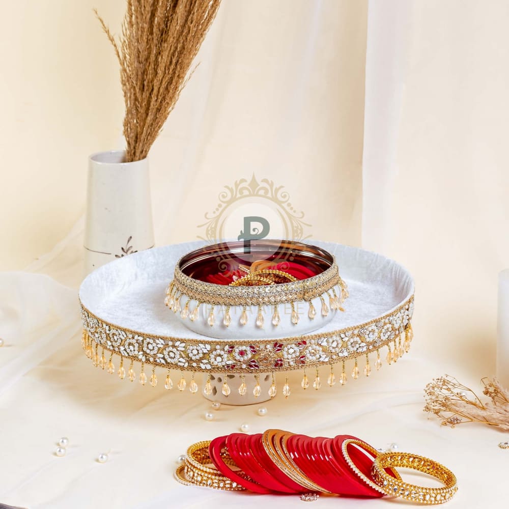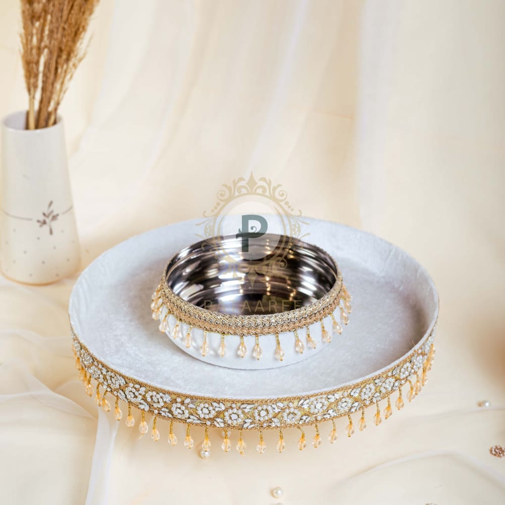 The chura ceremony is a momentous occasion, where the bride-to-be receives her cherished chura, brought by her maternal uncle. Celebrate this tradition in elegance with the Zehra collection thaal, beautifully paired with a large matching bowl, perfect for cleansing the chura in milk or kachi lassi.