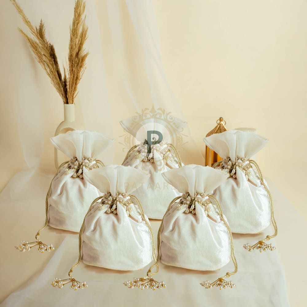 Make a statement of elegance with our Ivory Zehra Potli Set of 5, thoughtfully bundled for grand celebrations. Crafted in plush velvet with subtle champagne trims, each potli features exquisite pearl embellishments, golden doris, and tassels that radiate traditional beauty. Whether you're hosting a lavish event or curating premium giveaways, this set of five brings grace, style, and utility in equal measure.