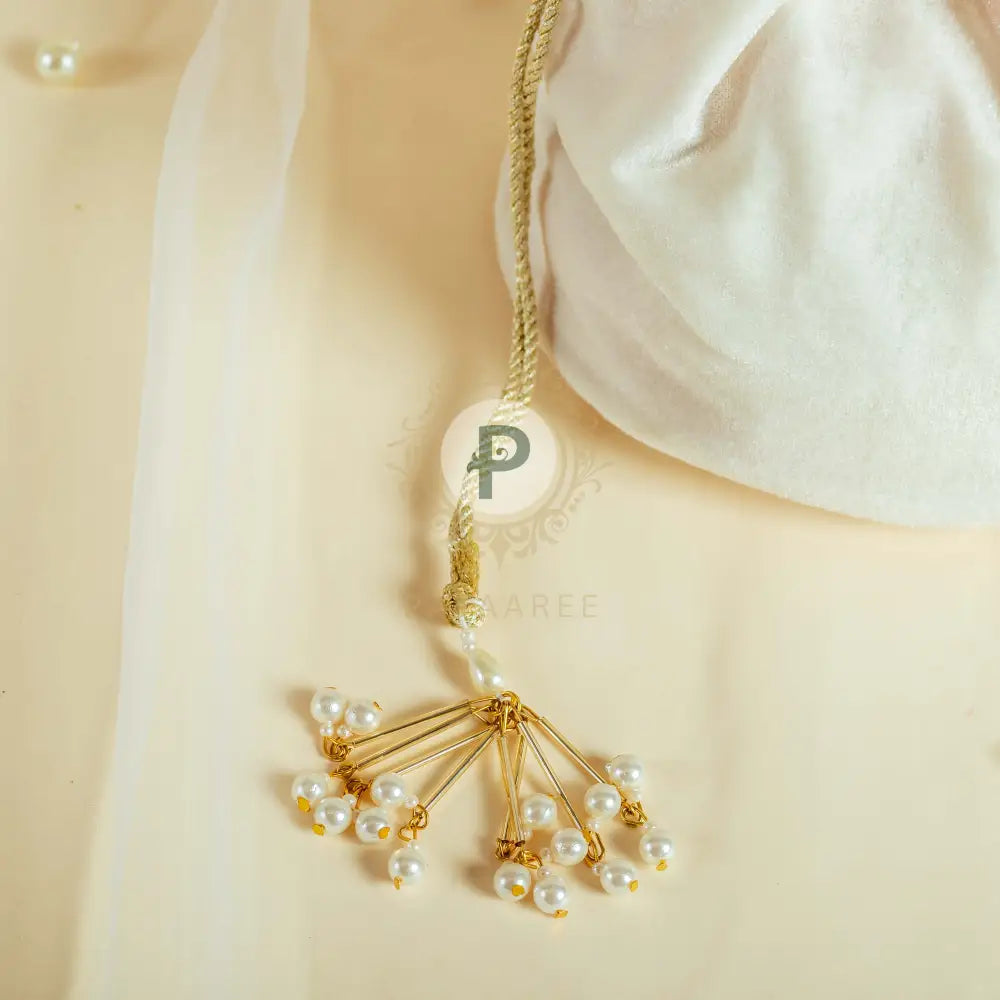 Gracefully crafted for moments that matter, our Ivory Zehra Potli Set of 3 is a bundle of charm and sophistication. Each potli features a soft velvet base adorned with champagne trims, delicate pearl hangings, and shimmering gold doris finished with pearl tassels. Whether you’re gifting sweets, dry fruits, or adding grace to your Shagun ceremony, this trio is perfect for creating a lasting impression.