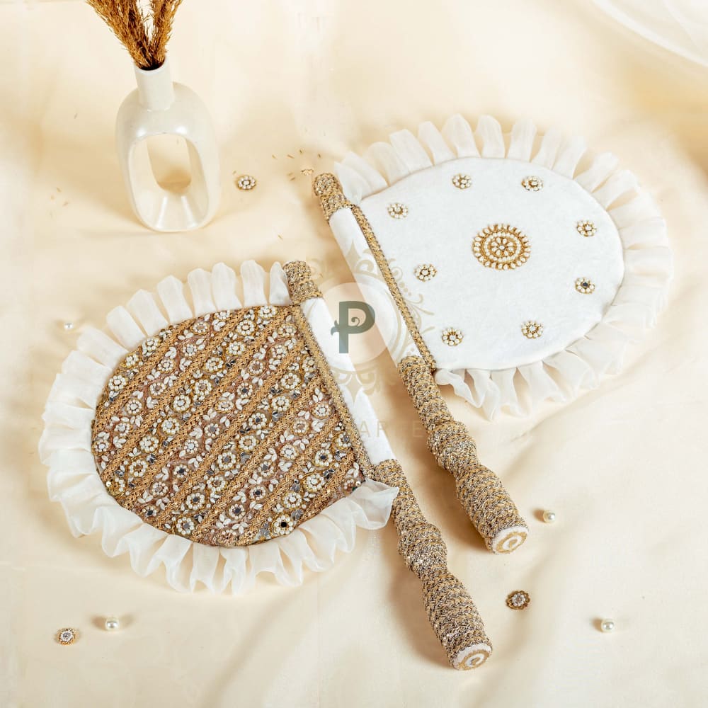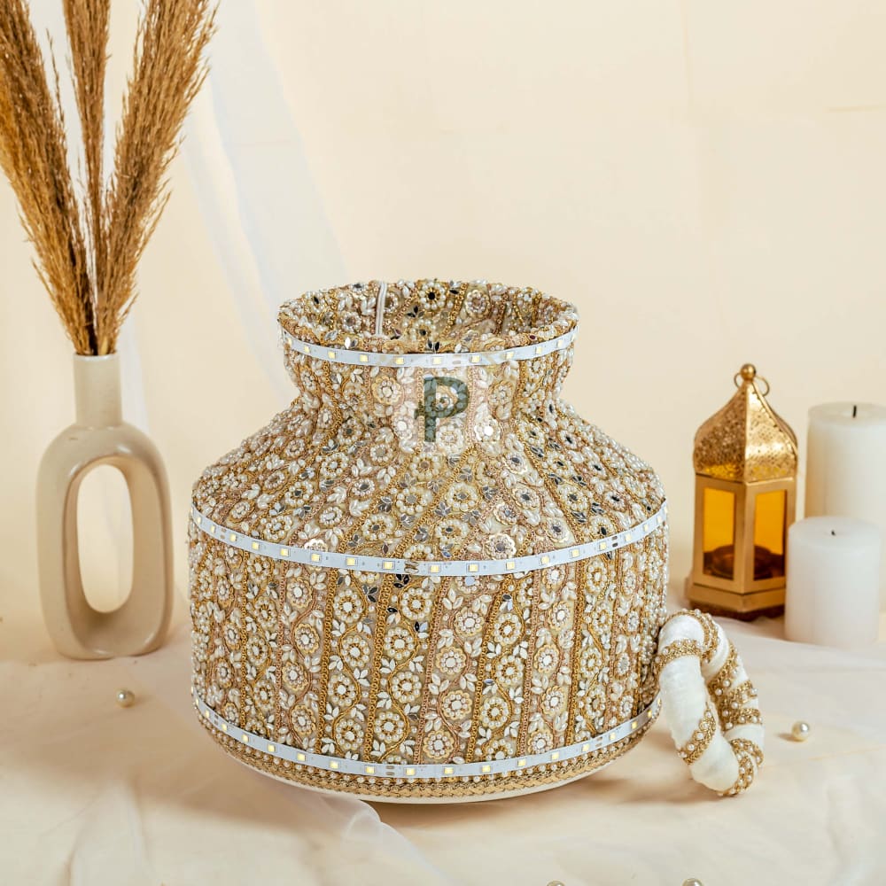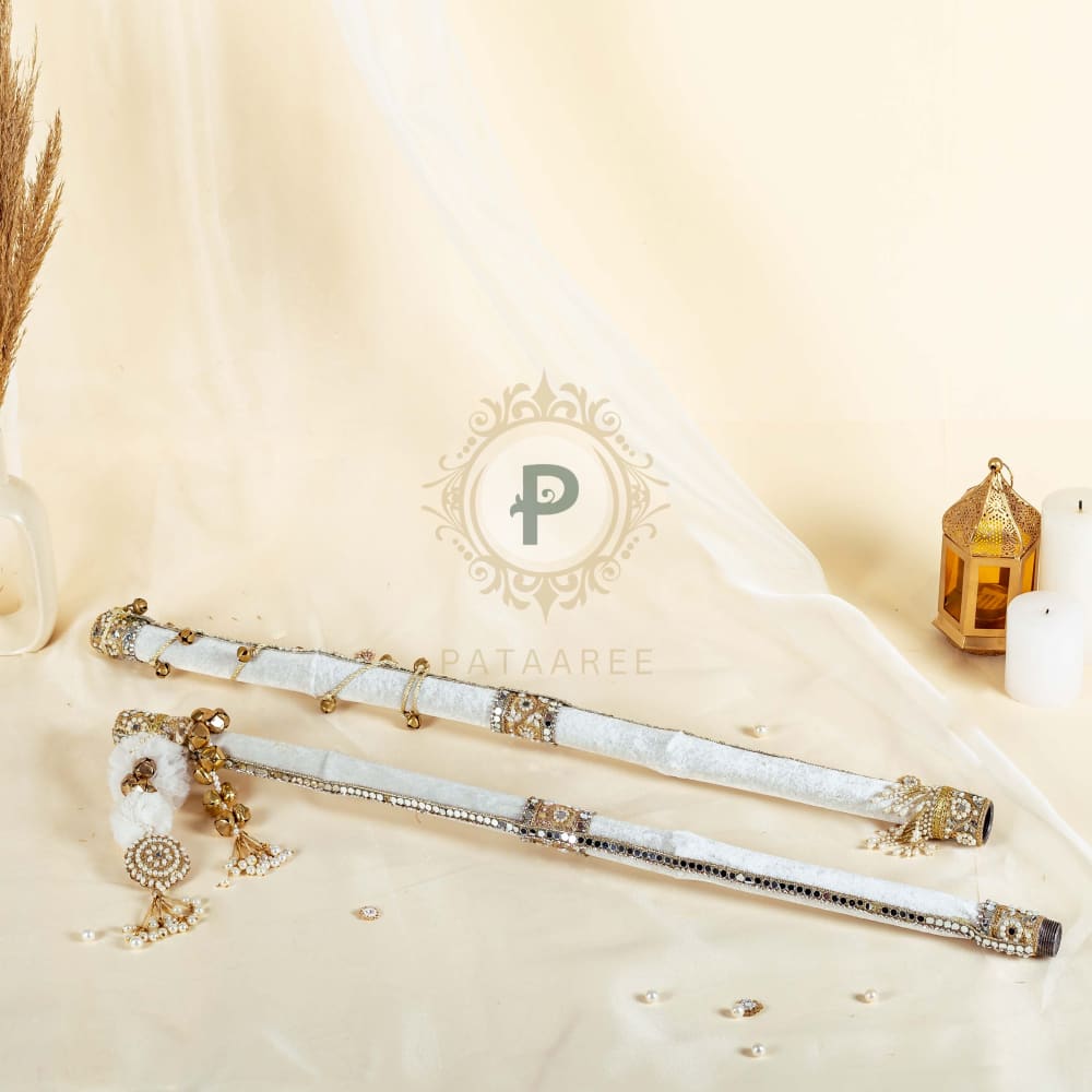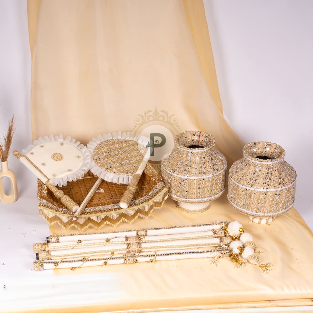 Our curated Jaago set from the exquisite Zehra collection includes 2 vibrant Jaago matkas, 2 beautiful pakhis, 2 long dandas adorned with ghungroos, and a traditional chajj with a small stick. Everything you need to make your celebration unforgettable—just add to your cart and let us handle the rest!