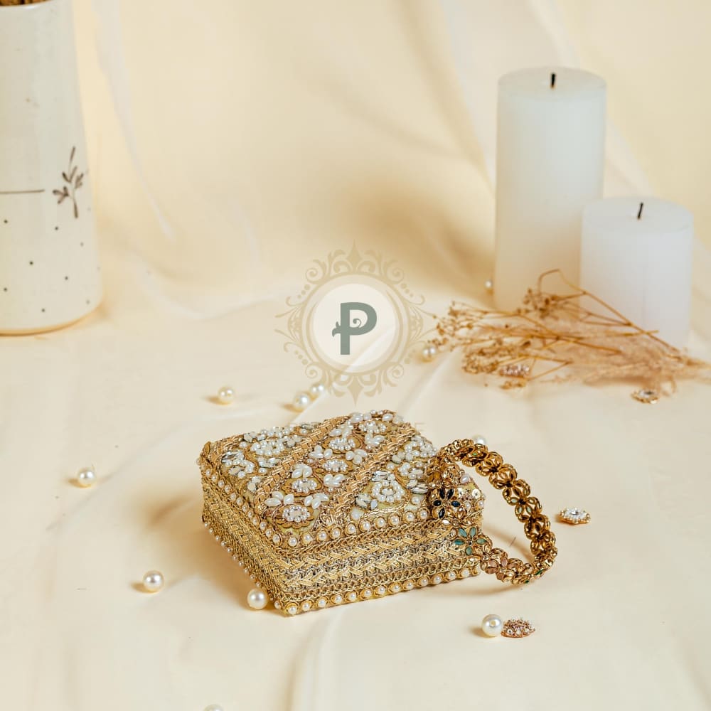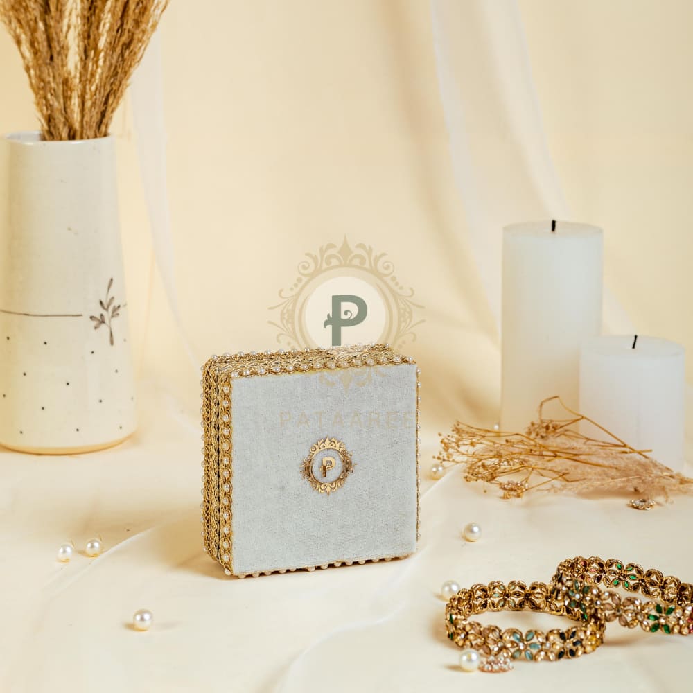 Adorned with champagne gold trims, styled with pretty little circular flowers made of pearls, the Zehra single kada box is a piece of jewel in itself, and makes a perfect bangle case for your Shagun jewellery.