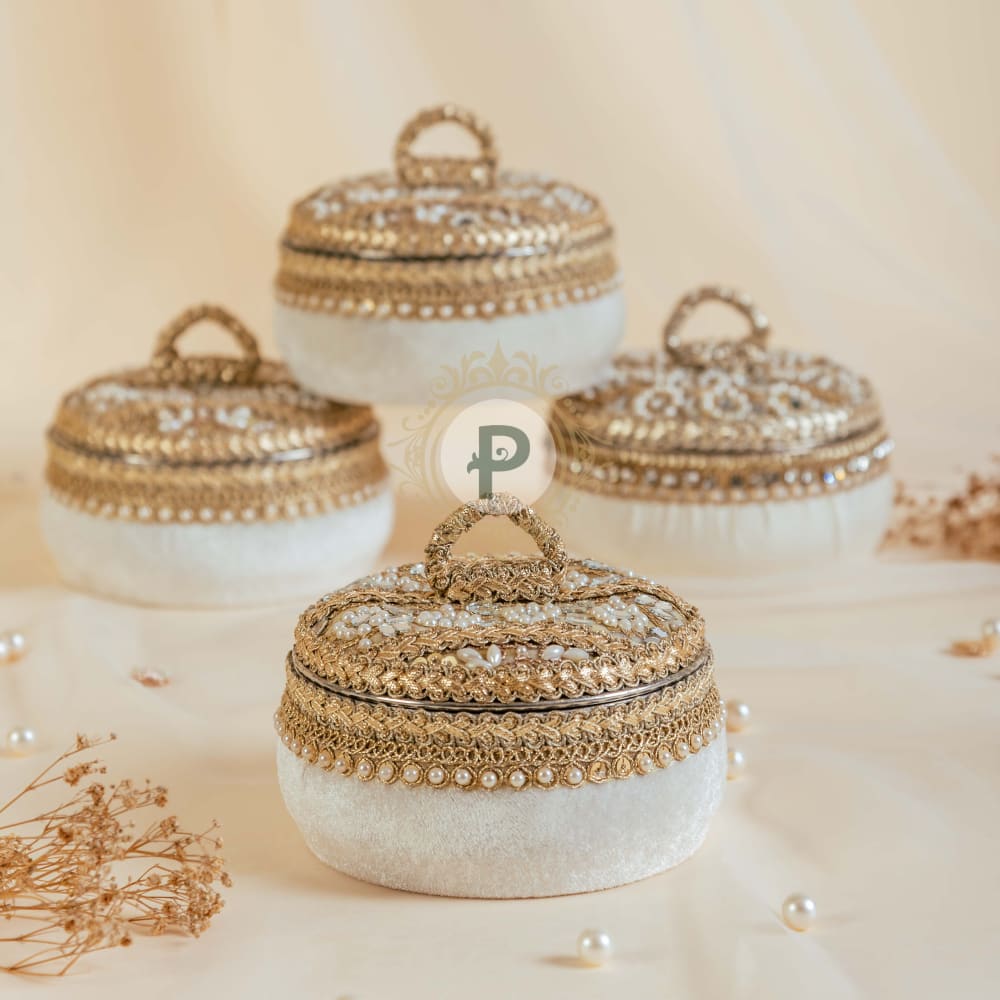 Wrapped in ivory coloured velvet fabric, the small laddoo boxes leave a sweet impression with exquisite pearl, mirror and bead dabka work, and can hold your small sweets like panjiri and dry fruit for Shagun ceremonies and gifting.