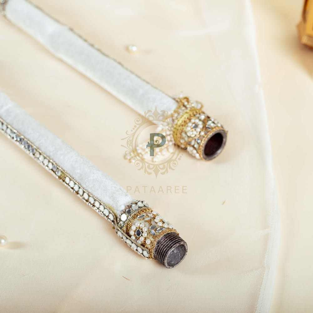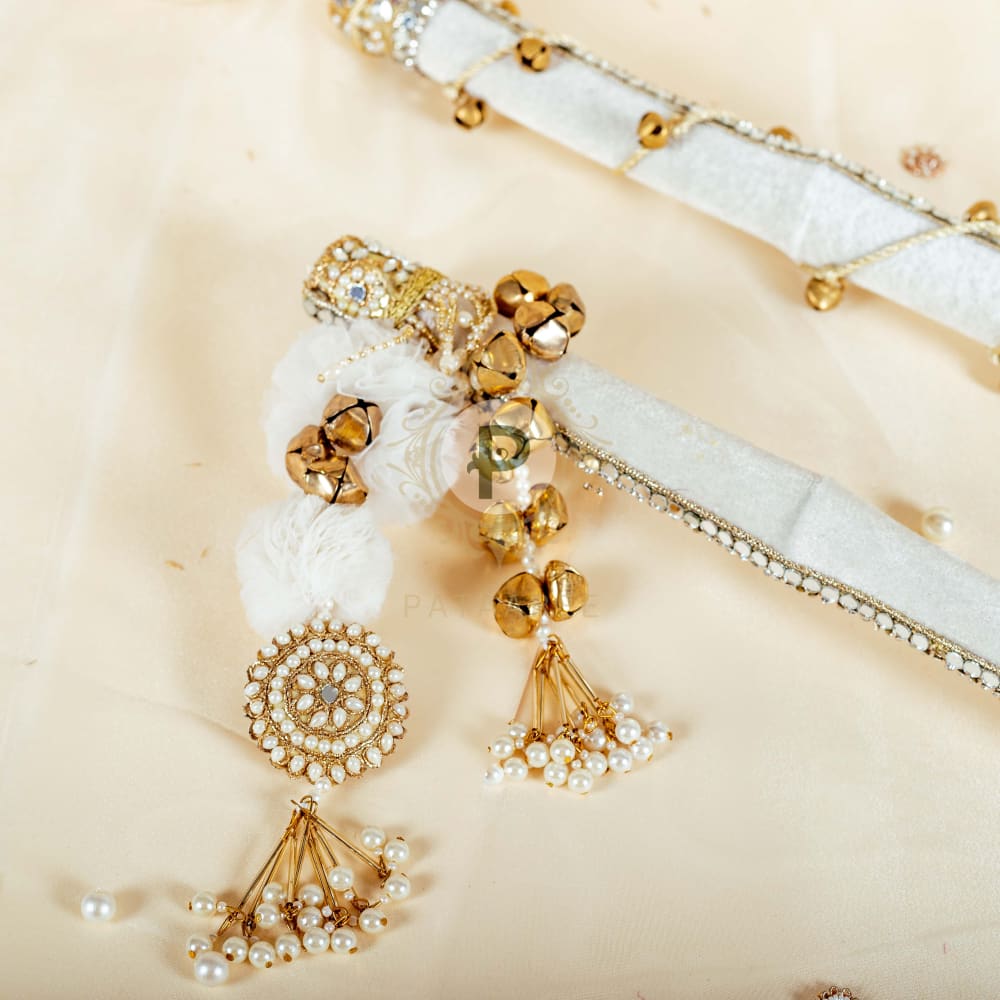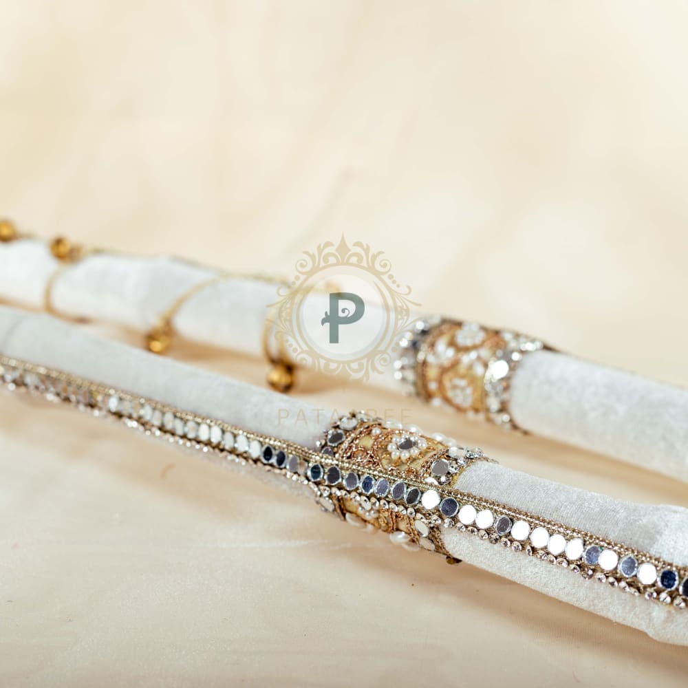Jaagi is all about rhythm and beat, and our long danda in ivory colored velvet fabric with mirror trims, shiny ghungroos, beaded tassels and tissue pompom sets just the right tone.