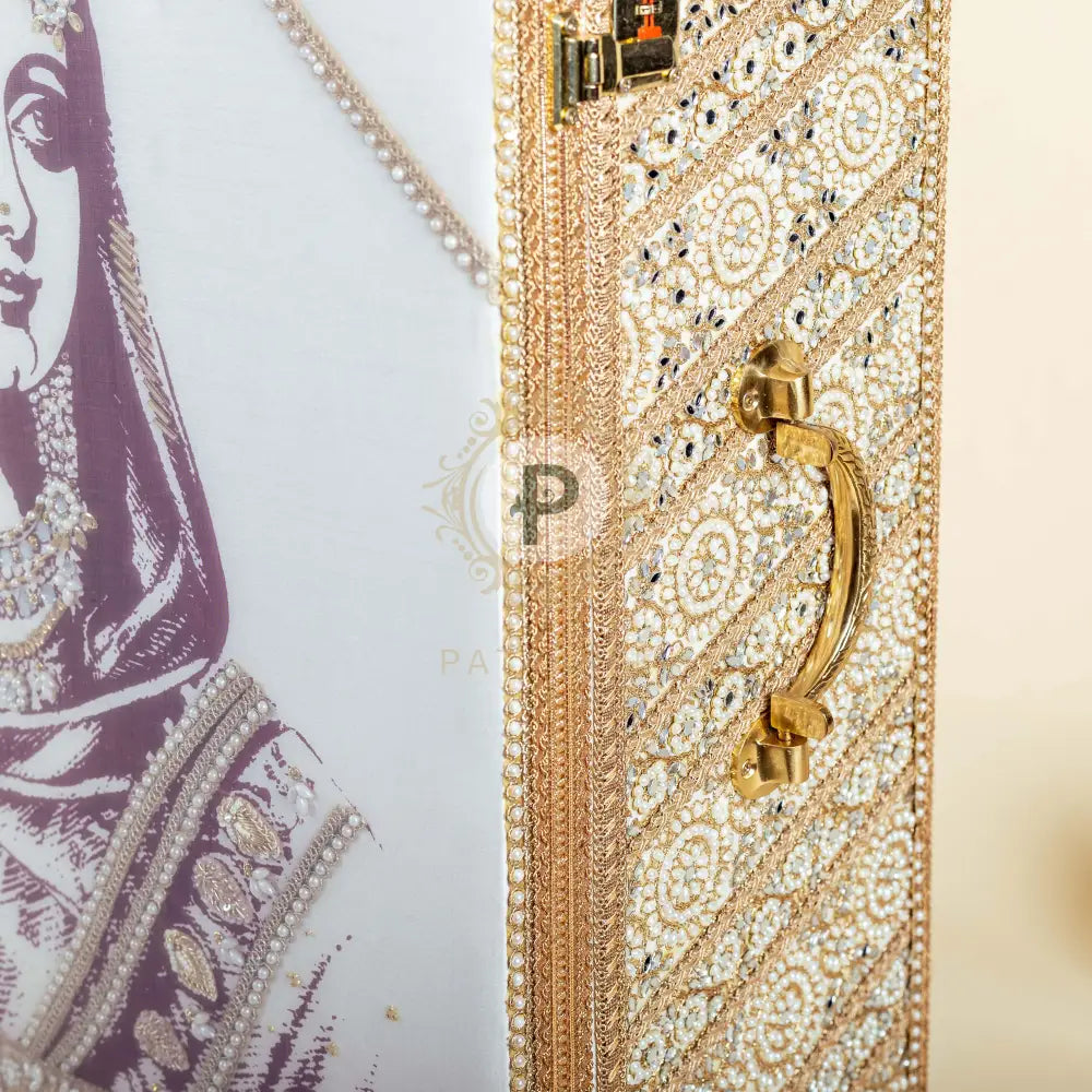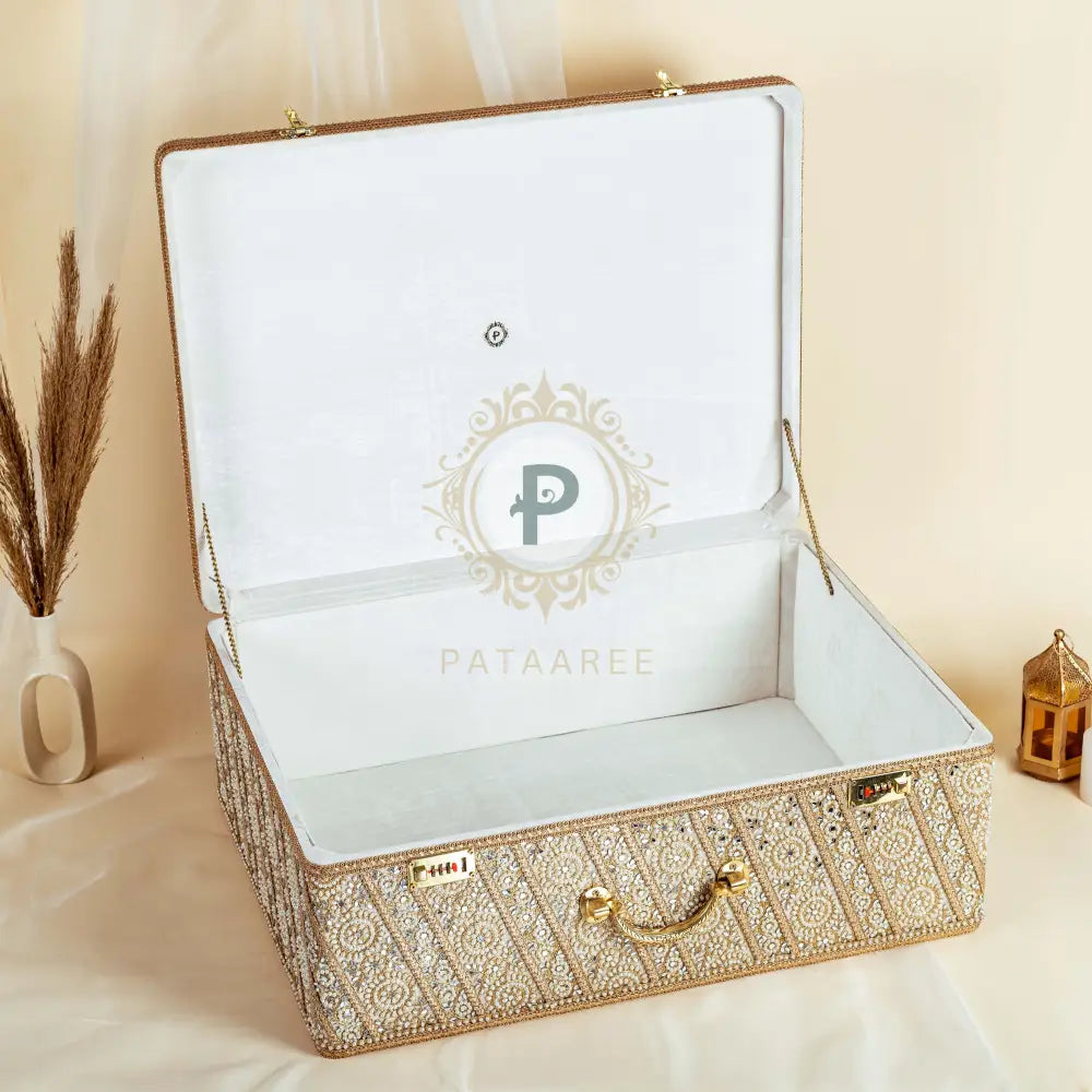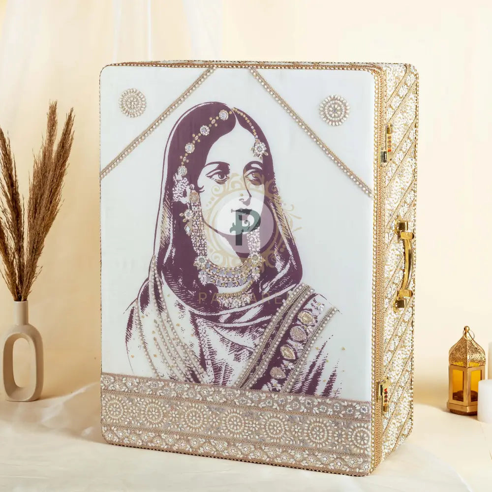 The Zehra collection is an ode to the Maharani in you, and our exclusive and exquisite handcrafted signature Zehra Maharani trunk is just the heirloom piece a bride should have to carry her porecious memories in. The detailing of pearls, mirror and beads on the trunk, modern locks to keep your treasures safe, velvet ivory colored fabric lining, the Maharani screen printed on it catapults Zehra Maharani the trunk to a luxurious status.