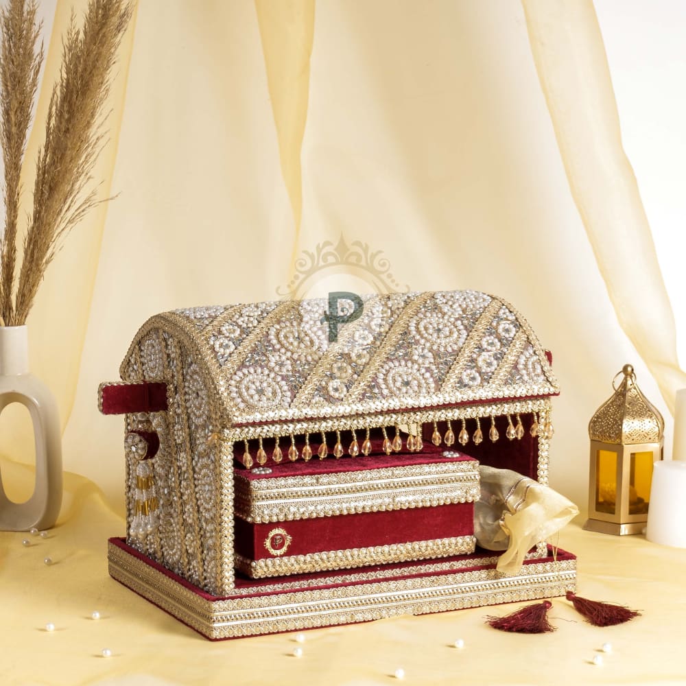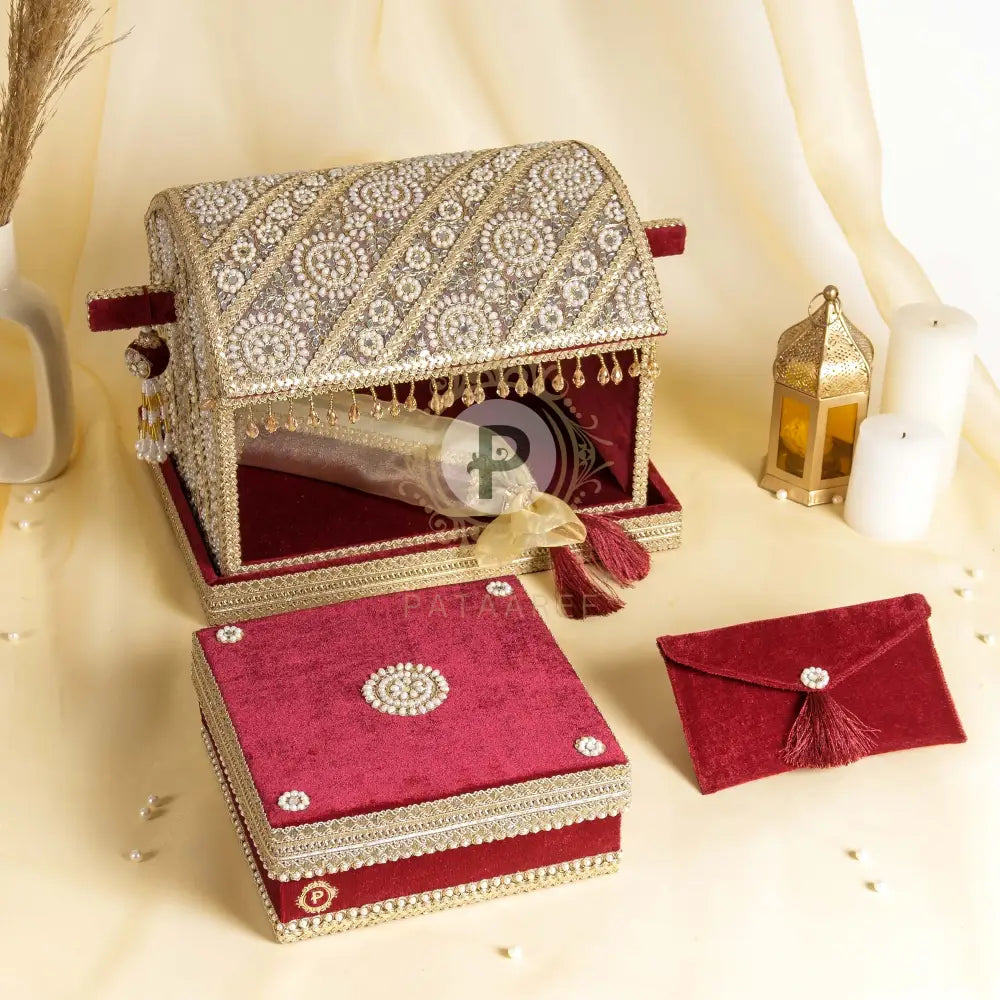 This maroon velvet Zehra Palki with golden detailing brings a regal touch to your Sahe Chithi moment. The mithai box shares sweetness, while the scroll carries your words across generations. Shagun envelope tie the ritual with warmth, blessings, and emotion, just as it’s been done for generations.