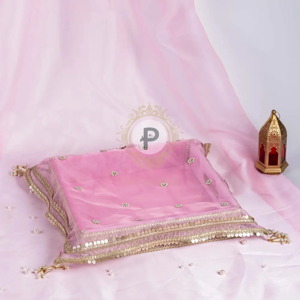 Gifts, cash, jewellery, clothes, sweets…the shagun ceremony comes with its exhaustive list of things, rituals and customs. The Zehra Collection shagun tray with cover in pastel pink is perfect for showcasing your shagun essentials. Draped in stately ivory velvet and detailed with pearl and champagne trims, the tray features a stunning translucent tissue cover. The cover adds a crystalline charm, delicately handcrafted with champagne gold sequins and pearl floral accents.