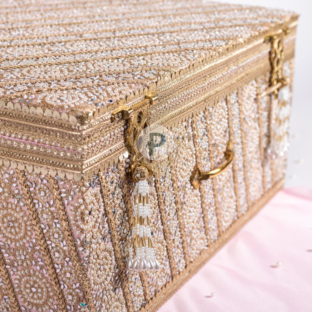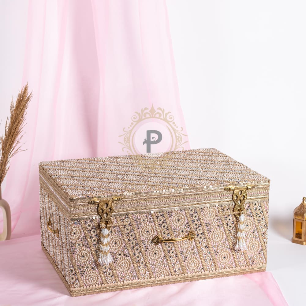 The heart of every bridal trousseau, the Zehra trousseau trunk is a masterpiece in pastel pink, exquisitely handcrafted with a delicate interplay of pearls, mirrors, and fine beadwork. Its charm is elevated with elegant traditional brass handles and signature tasseled lock-keys, giving it an aura of regal sophistication.