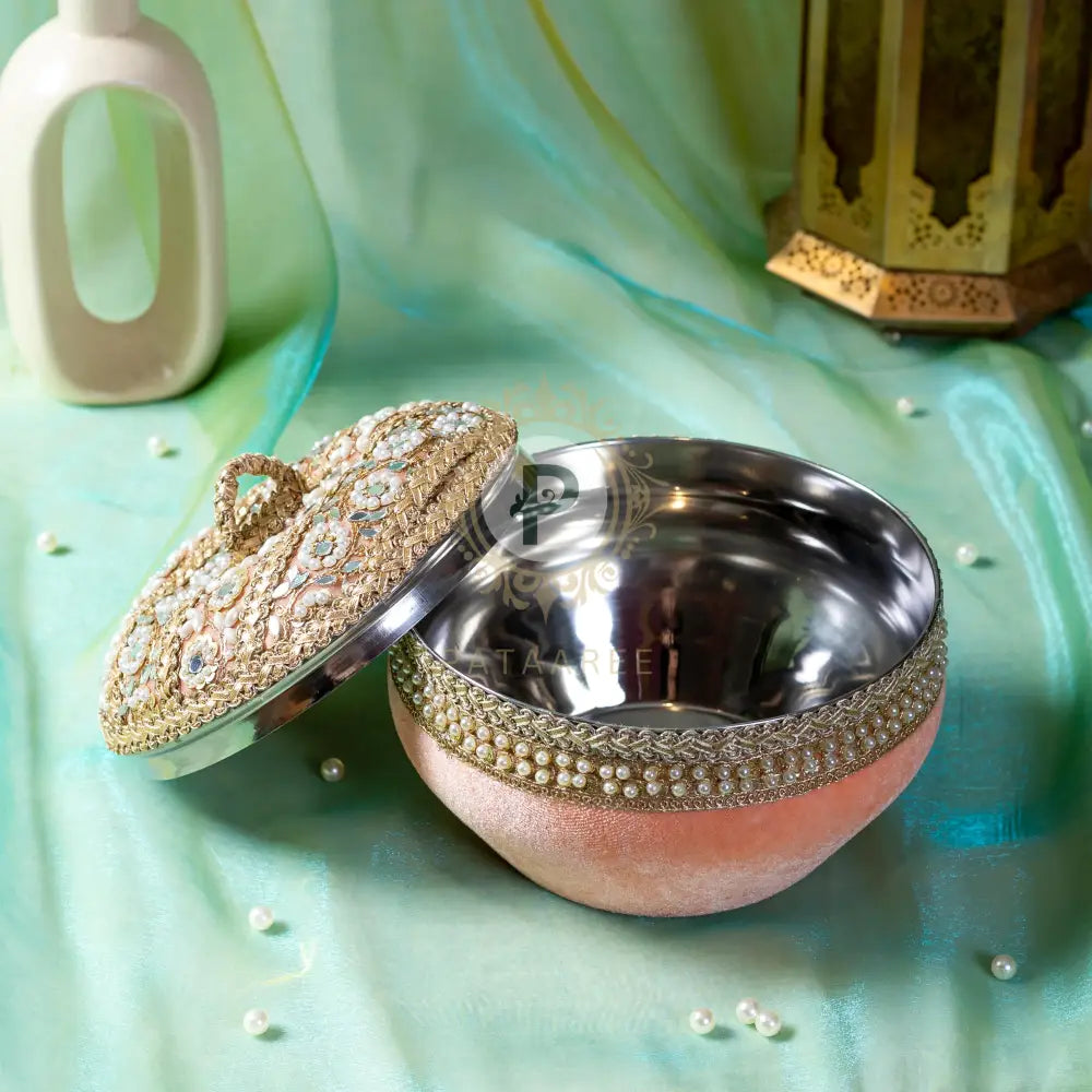 Wrapped in soft peach velvet fabric, these large laddoo boxes leave a lasting impression with delicate pearl, mirror, and bead dabka embellishments. Perfectly sized to carry a generous amount of sweets, chocolates, dry fruits, and more for Shagun ceremonies, they also make a thoughtful gift for weddings.