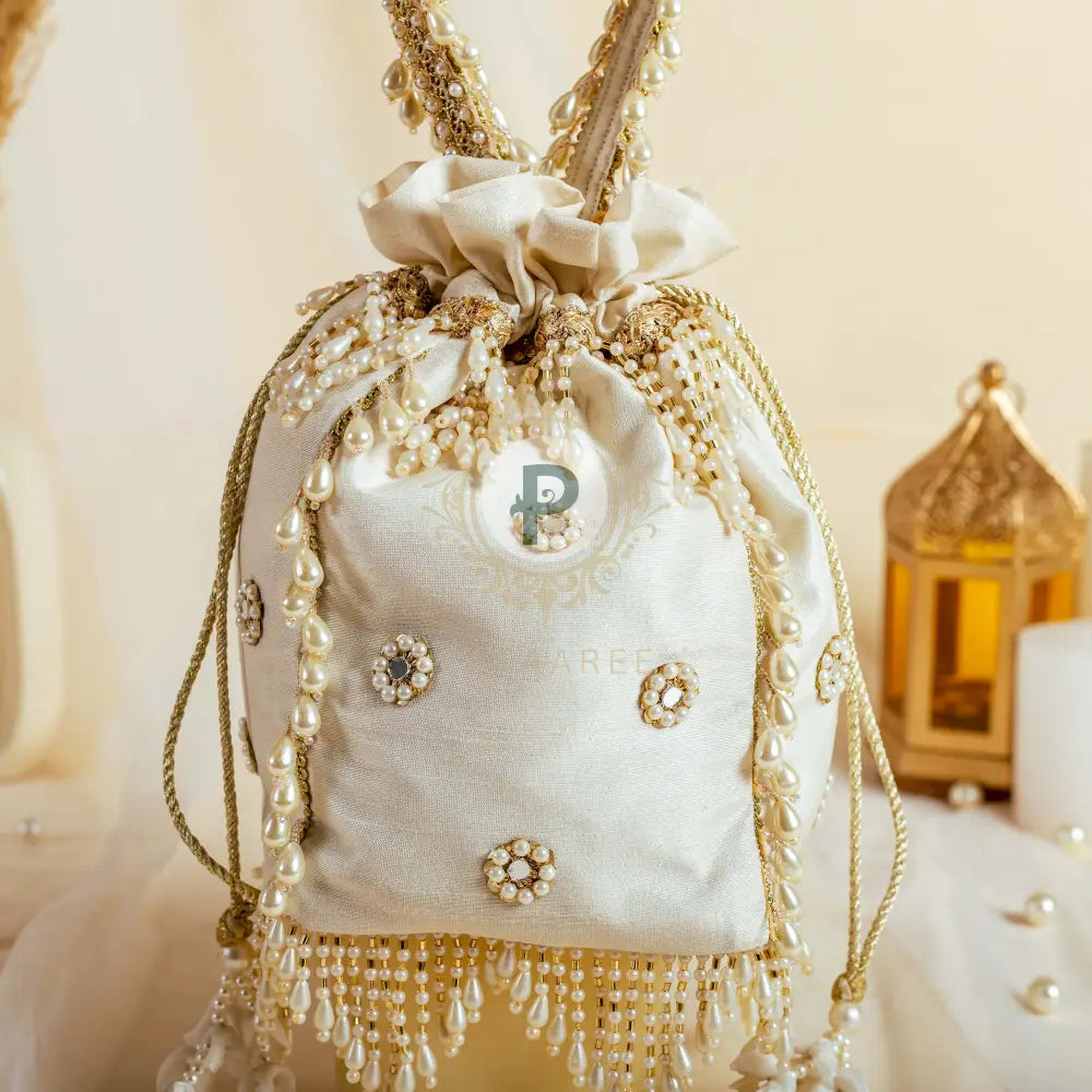 Elegance and sophistication reflect beautifully in our handmade Zehra potlis. The smooth ivory colored silk fabric with champagne trims and pearl hangings at the neck of the potli drawn together by gold doris with pearl tassels is the ideal product for gifting, sweets, dry fruits or simply flaunting at the Shagun ceremony.