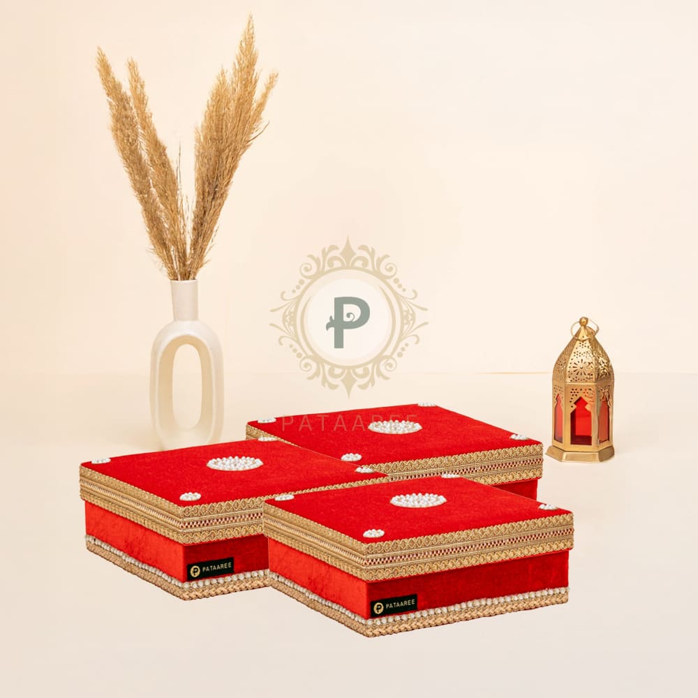 Elegant, chic, and irresistibly sweet — the Zehra Collection mithai box in radiant red, adorned with Zehra pearl flowers and champagne gold trims, holds up to 1kg of mithai and makes a lasting impression at every wedding celebration.