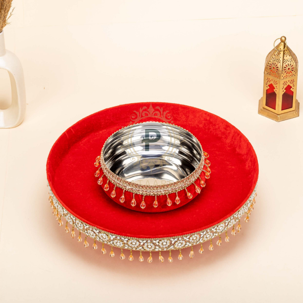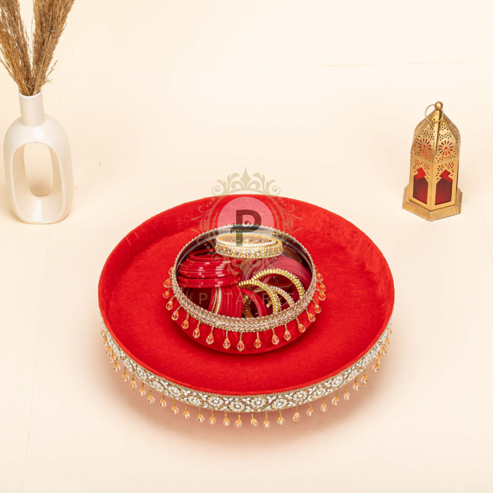 The chura ceremony marks a significant milestone for the bride-to-be, with her maternal uncle bringing the iconic chura set. Place your chura in the stunning red Zehra collection thaal, complete with a matching bowl for cleansing in milk or kachi lassi—adding beauty and tradition to the celebration.