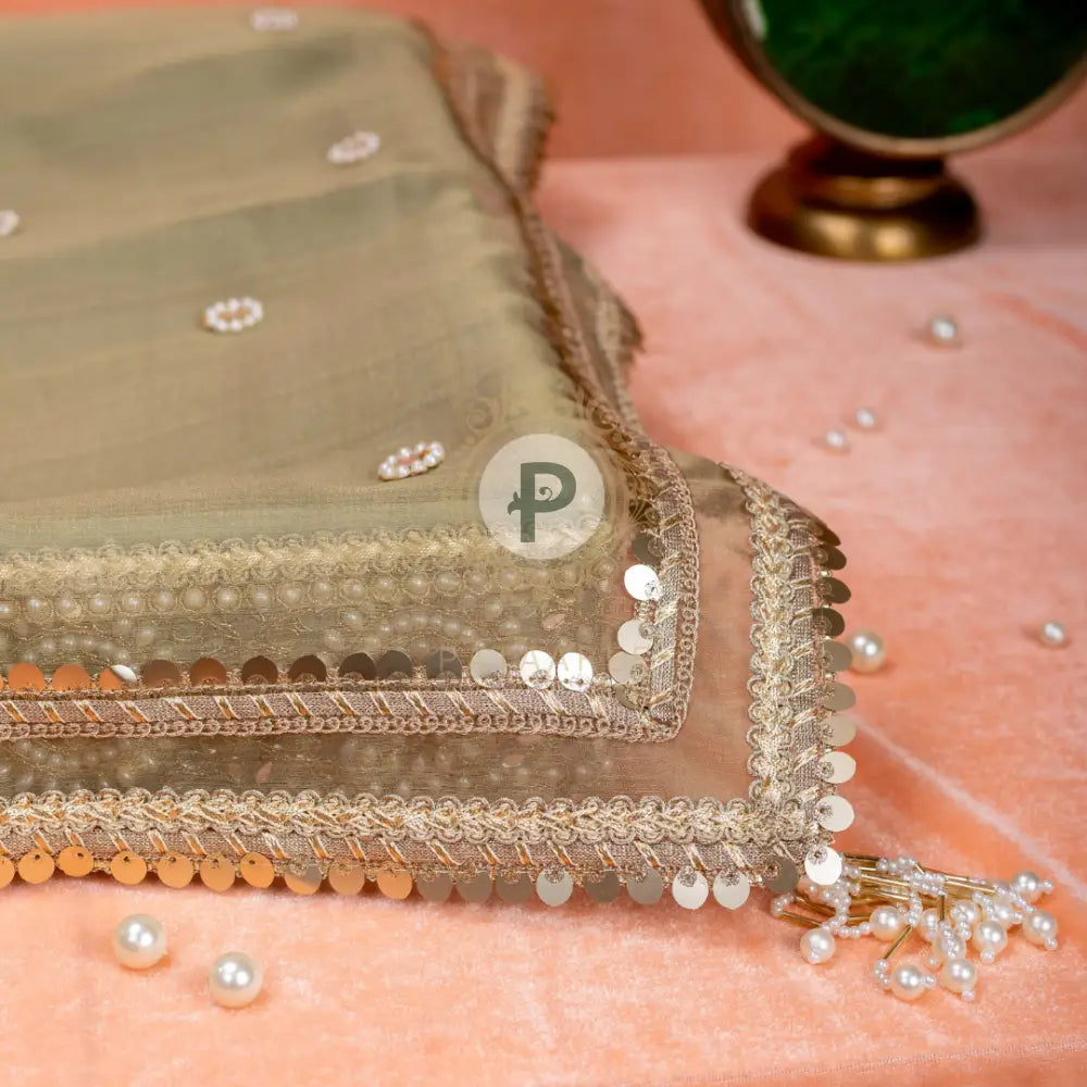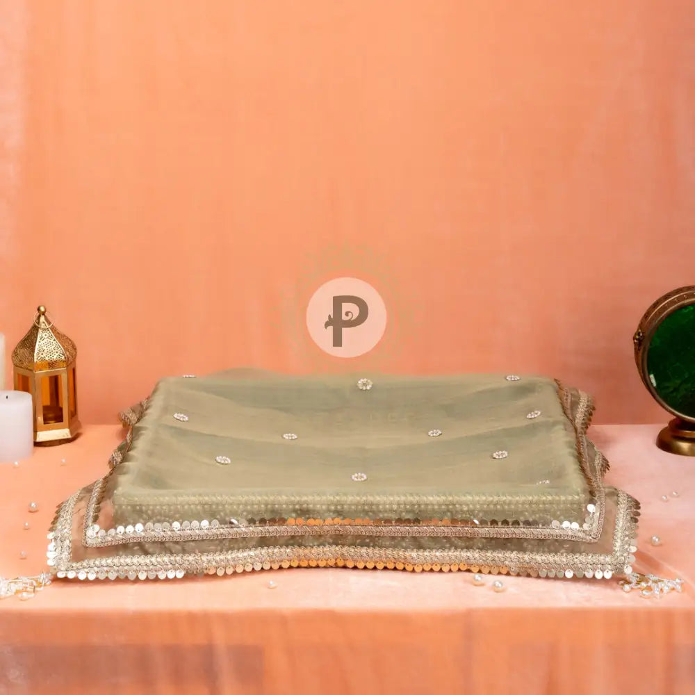 Gifts, cash, jewellery, clothes, sweets… the shagun ceremony brings with it an array of customs. The Zehra Collection wedding tray with cover, in a regal ivory velvet and sage green accents, is perfect for presenting shagun essentials. Adorned with delicate pearl and champagne trims, its highlight is a sheer tissue cover, handcrafted with champagne-gold sequins and pearl florals for a crystalline finish.